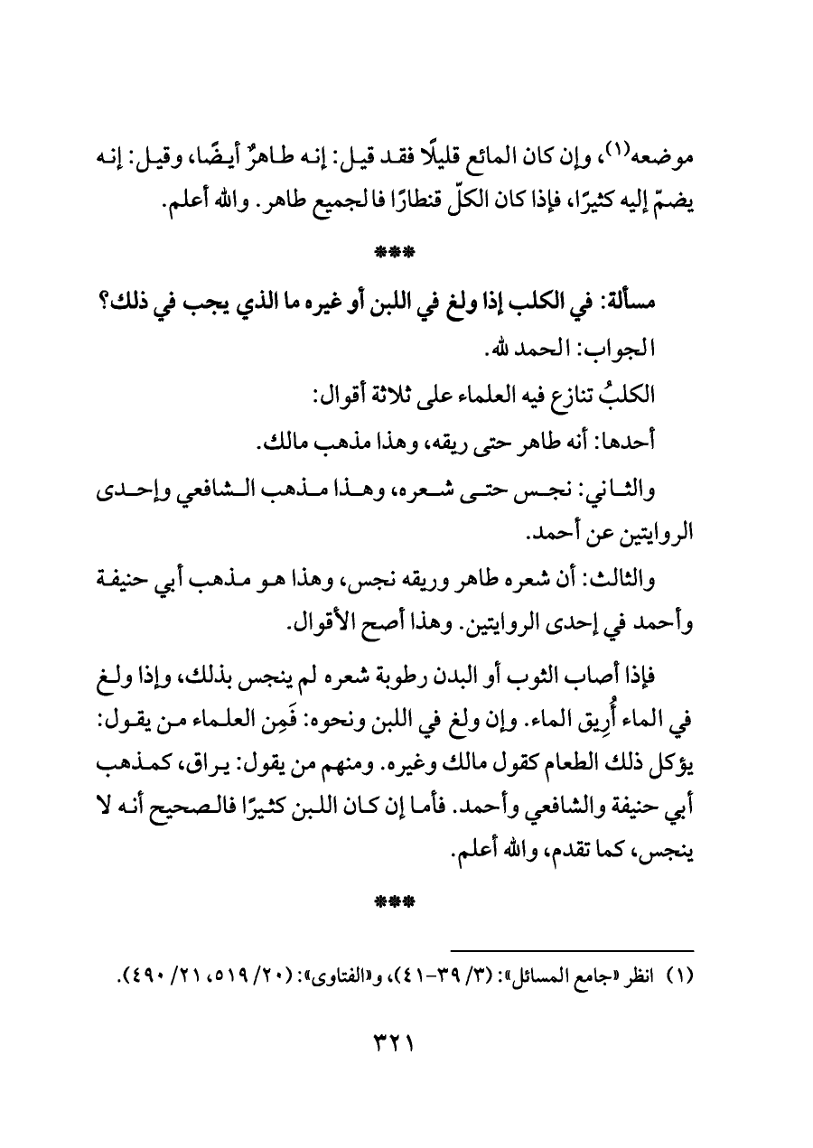 فإذا أصاب الثوب أو البدن رطوبة شعره لم ينجس بذلك، وإذا ولغ في الماء أُرِيق الماء. وإن ولغ في اللبن ونحوه: فَمِن العلماء من يقول: يؤكل ذلك الطعام كقول مالك وغيره. ومنهم من يقول: يراق، كمذهب أبي حنيفة والشافعي وأحمد. فأما إن كان اللبن كثيرًا فالصحيح أنه لا ينجس، كما تقدم، والله أعلم.