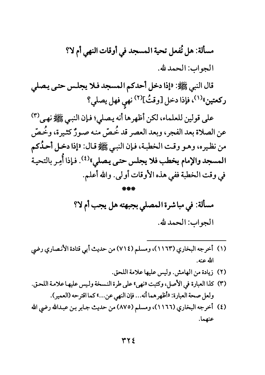مسألة: هل تُفعل تحية المسجد في أوقات النهي أم لا؟