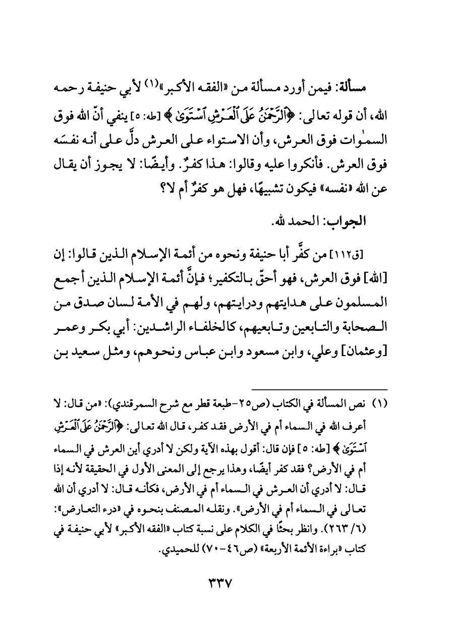 (¬١) نص المسألة في الكتاب (ص ٢٥ - طبعة قطر مع شرح السمرقندي): "من قال: لا أعرف الله في السماء أم في الأرض فقد كفر، قال الله تعالى: {الرَّحْمَنُ عَلَى الْعَرْشِ اسْتَوَى} [طه: ٥] فإن قال: أقول بهذه الآية ولكن لا أدري أين العرش في السماء أم في الأرض؟ فقد كفر أيضًا، وهذا يرجع إلى المعنى الأول في الحقيقة لأنه إذا قال: لا أدري أن العرش في السماء أم في الأرض، فكأنه قال: لا أدري أن الله تعالى في السماء أم في الأرض". ونقله المصنف بنحوه في "درء التعارض": (٦/ ٢٦٣). وانظر بحثًا في الكلام على نسبة كتاب "الفقه الأكبر" لأبي حنيفة في كتاب "براءة الأئمة الأربعة" (ص ٤٦ - ٧٠) للحميدي.