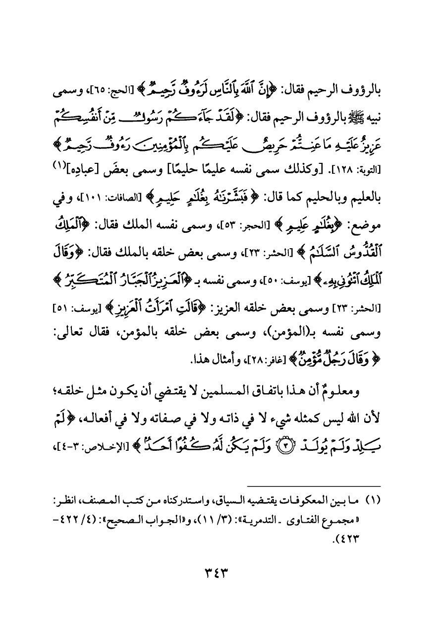 بالعليم وبالحليم كما قال: {فَبَشَّرْنَاهُ بِغُلَامٍ حَلِيمٍ} [الصافات: ١٠١] وفي موضع: {بِغُلَامٍ عَلِيمٍ} [الحجر: ٥٣] وسمى نفسه الملك فقال: {الْمَلِكُ الْقُدُّوسُ السَّلَامُ} [الحشر: ٢٣] وسمى بعض خلقه بالملك فقال: {وَقَالَ الْمَلِكُ ائْتُونِي بِهِ} [يوسف: ٥٠] وسمى نفسه بـ {الْعَزِيزُ الْجَبَّارُ الْمُتَكَبِّرُ} [الحشر: ٢٣] وسمى بعض خلقه العزيز: {قَالَتِ امْرَأَتُ الْعَزِيزِ} [يوسف: ٥١] وسمى نفسه بـ (المؤمن)، وسمى بعض خلقه بالمؤمن، فقال تعالى: {وَقَالَ رَجُلٌ مُؤْمِنٌ} [غافر: ٢٨] وأمثال هذا.