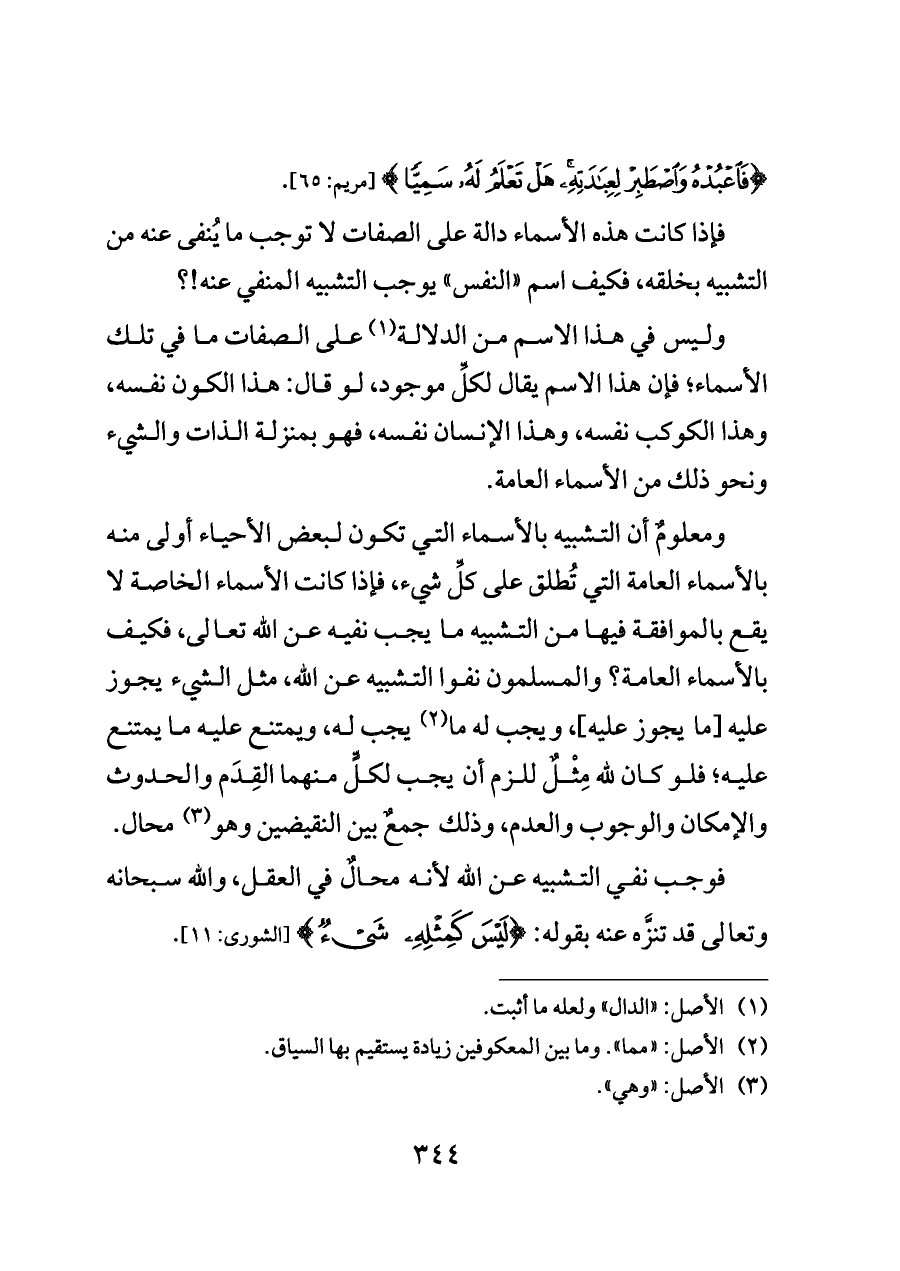 فإذا كانت هذه الأسماء دالة على الصفات لا توجب ما يُنفى عنه من التشبيه بخلقه، فكيف اسم "النفس" يوجب التشبيه المنفي عنه!؟