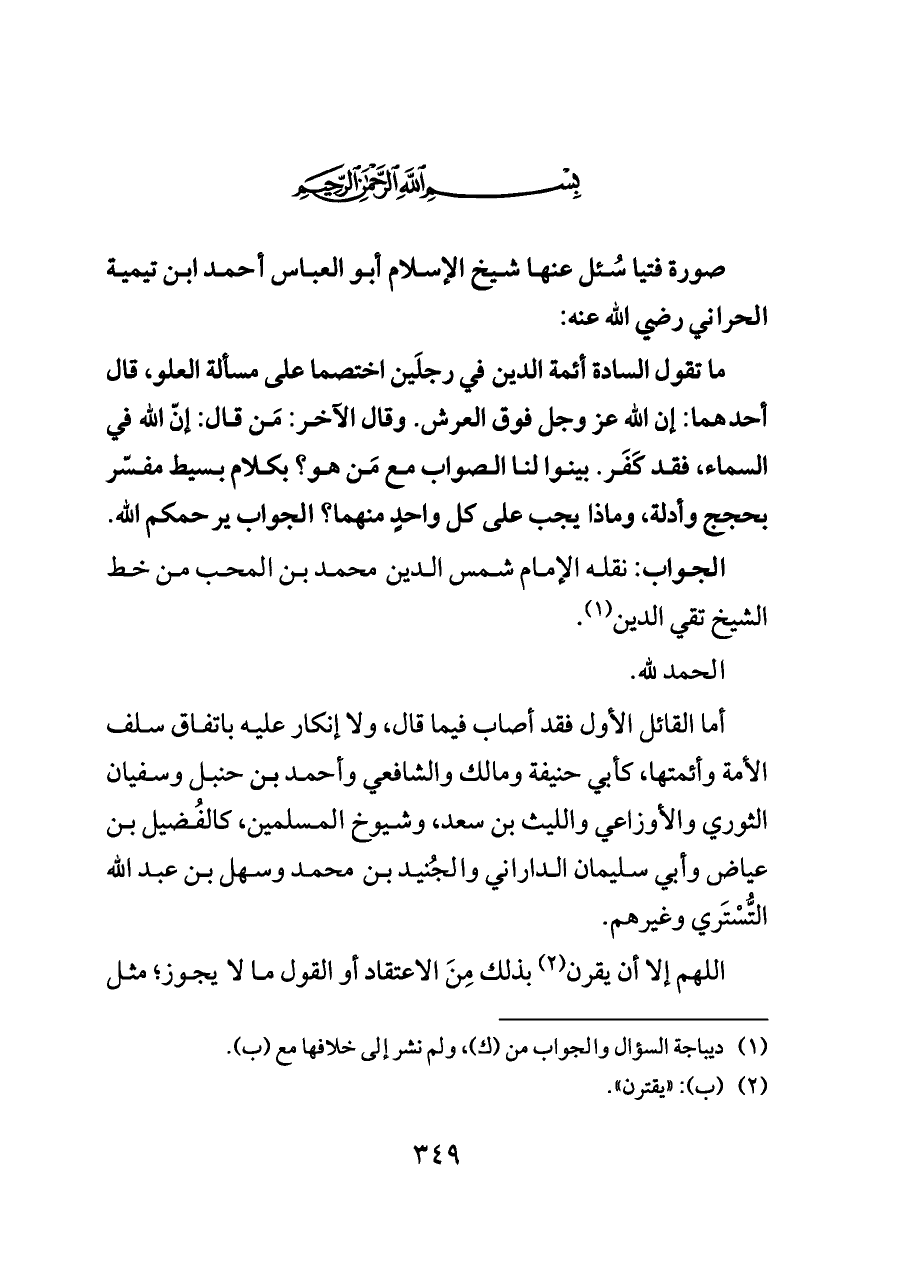صورة فتيا سُئل عنها شيخ الإسلام أبو العباس أحمد ابن تيمية الحراني رضي الله عنه: