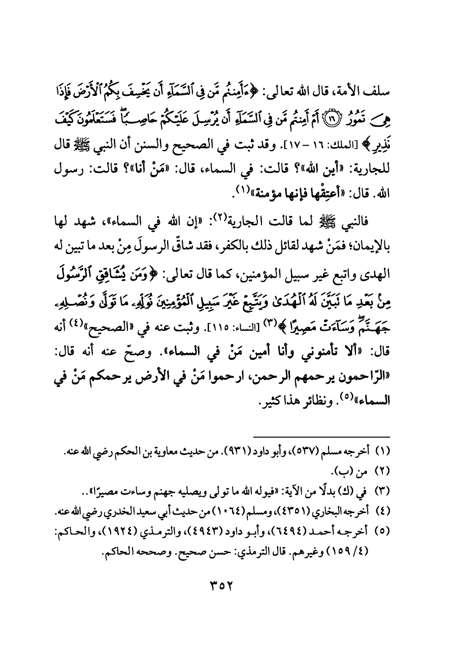 سلف الأمة، قال الله تعالى: {أَأَمِنْتُمْ مَنْ فِي السَّمَاءِ أَنْ يَخْسِفَ بِكُمُ الْأَرْضَ فَإِذَا هِيَ تَمُورُ (١٦) أَمْ أَمِنْتُمْ مَنْ فِي السَّمَاءِ أَنْ يُرْسِلَ عَلَيْكُمْ حَاصِبًا فَسَتَعْلَمُونَ كَيْفَ نَذِيرِ} [الملك: ١٦ - ١٧] وقد ثبت في الصحيح والسنن أن النبي - صلى الله عليه وسلم - قال للجارية: "أين الله"؟ قالت: في السماء، قال: "مَنْ أنا"؟ قالت: رسول الله. قال: "أعتِقْها فإنها مؤمنة" (¬١).
