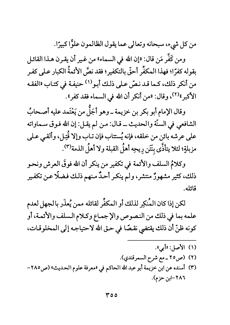 ومن كَفَّر مَن قال: "إن الله في السماء" من غير أن يقرن هذا القائل بقوله كفرًا؛ فهذا المكفِّر أحقّ بالتكفير؛ فقد نصَّ الأئمةُ الكبار على كفر من أنكر ذلك، كما قد نصّ على ذلك أبو (¬١) حنيفة في كتاب "الفقه الأكبر" (¬٢)، وقال: "من أنكر أن الله في السماء فقد كفر".