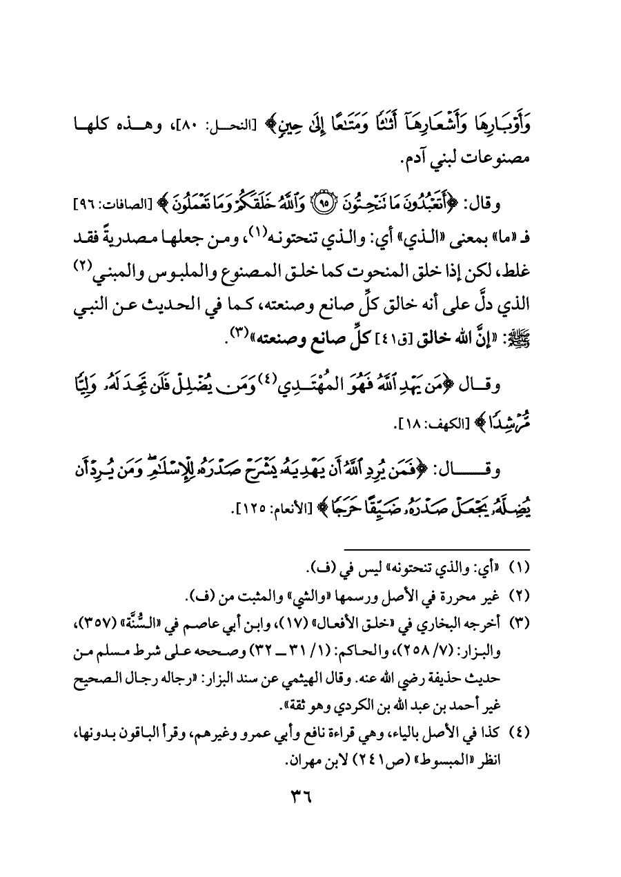 وقال: {أَتَعْبُدُونَ مَا تَنْحِتُونَ (٩٥) وَاللَّهُ خَلَقَكُمْ وَمَا تَعْمَلُونَ} [الصافات: ٩٦] فـ «ما» بمعنى «الذي» أي: والذي تنحتونه (¬١)، ومن جعلها مصدريةً فقد غلط، لكن إذا خلق المنحوت كما خلق المصنوع والملبوس والمبني (¬٢) الذي دلَّ على أنه خالق كلِّ صانع وصنعته، كما في الحديث عن النبي - صلى الله عليه وسلم -: «إنَّ الله خالق [ق ٤١] كلِّ صانع وصنعته» (¬٣).
