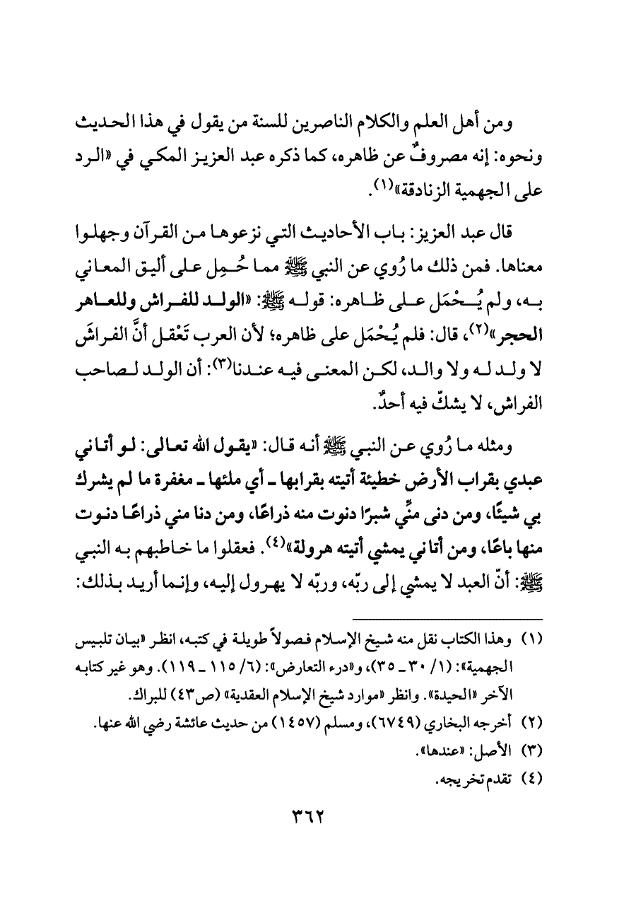 ومثله ما رُوي عن النبي - صلى الله عليه وسلم - أنه قال: «يقول الله تعالى: لو أتاني عبدي بقراب الأرض خطيئة أتيته بقرابها ــ أي ملئها ــ مغفرة ما لم يشرك بي شيئًا، ومن دنى منِّي شبرًا دنوت منه ذراعًا، ومن دنا مني ذراعًا دنوت منها باعًا، ومن أتاني يمشي أتيته هرولة» (¬٤). فعقلوا ما خاطبهم به النبي - صلى الله عليه وسلم -: أنّ العبد لا يمشي إلى ربّه، وربّه لا يهرول إليه، وإنما أريد بذلك: