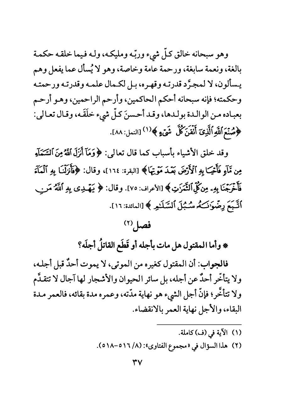 وقد خلق الأشياء بأسباب كما قال تعالى: {وَمَا أَنْزَلَ اللَّهُ مِنَ السَّمَاءِ مِنْ مَاءٍ فَأَحْيَا بِهِ الْأَرْضَ بَعْدَ مَوْتِهَا} [البقرة: ١٦٤]، وقال: {فَأَنْزَلْنَا بِهِ الْمَاءَ فَأَخْرَجْنَا بِهِ مِنْ كُلِّ الثَّمَرَاتِ} [الأعراف: ٧٥]. وقال: {يَهْدِي بِهِ اللَّهُ مَنِ اتَّبَعَ رِضْوَانَهُ سُبُلَ السَّلَامِ} [المائدة: ١٦].