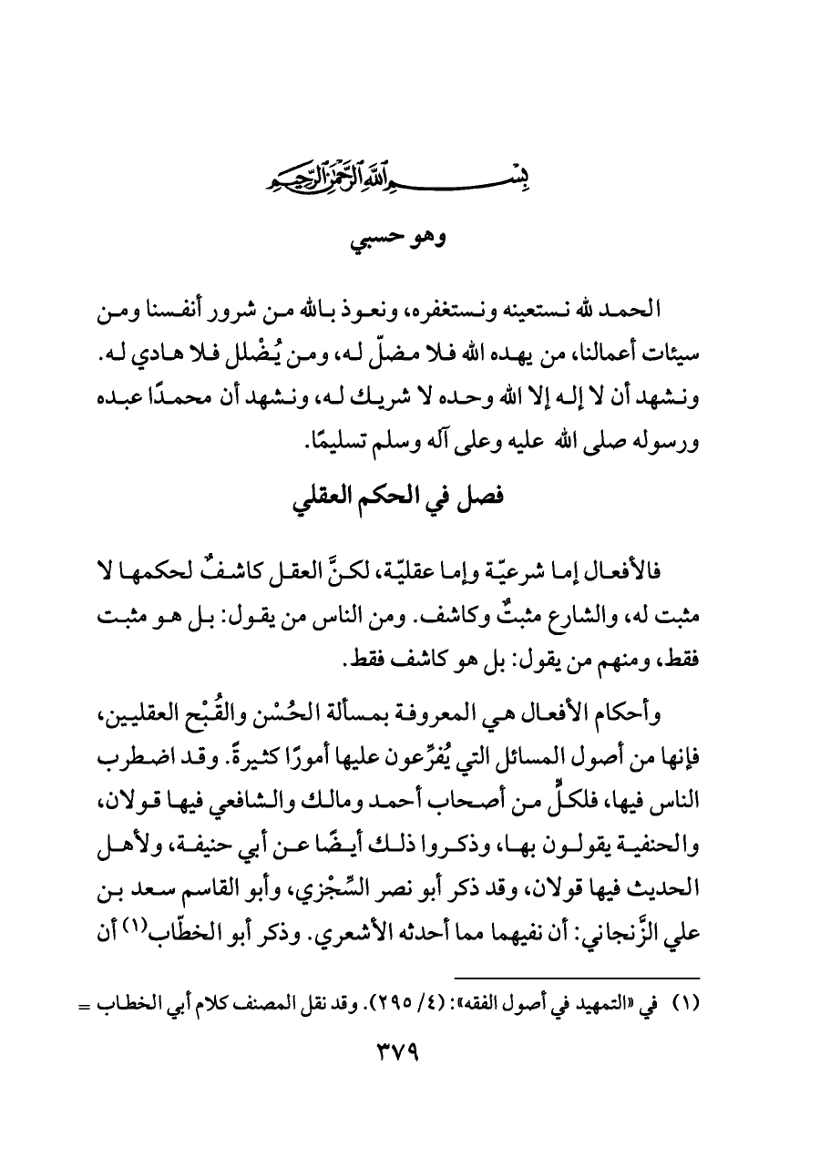 وأحكام الأفعال هي المعروفة بمسألة الحُسْن والقُبْح العقليين، فإنها من أصول المسائل التي يُفرِّعون عليها أمورًا كثيرةً. وقد اضطرب الناس فيها، فلكلٍّ من أصحاب أحمد ومالك والشافعي فيها قولان، والحنفية يقولون بها، وذكروا ذلك أيضًا عن أبي حنيفة، ولأهل الحديث فيها قولان، وقد ذكر أبو نصر السِّجْزي، وأبو القاسم سعد بن علي الزَّنجاني: أن نفيهما مما أحدثه الأشعري. وذكر أبو الخطّاب (¬١) أن