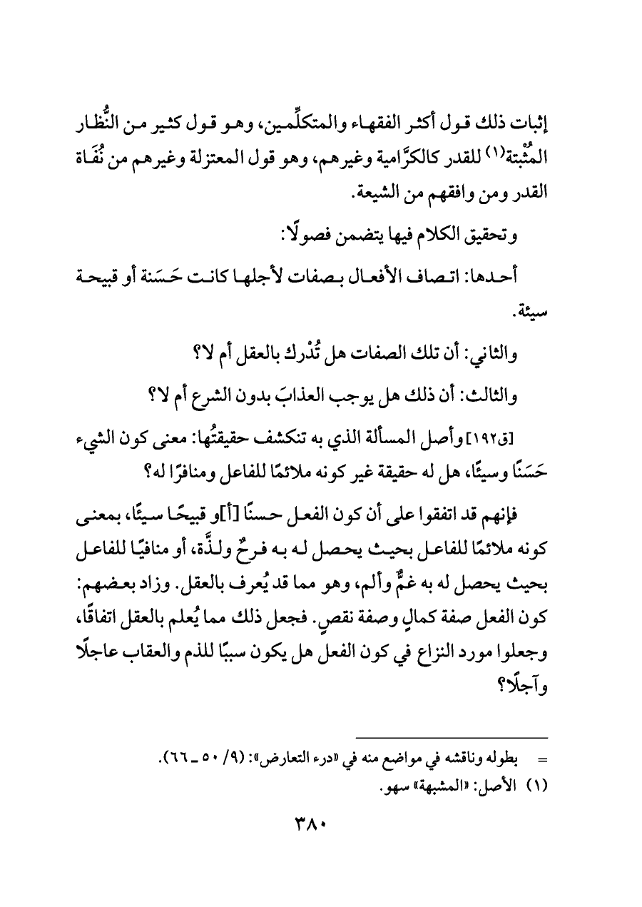 فإنهم قد اتفقوا على أن كون الفعل حسنًا [أ] و قبيحًا سيئًا، بمعنى كونه ملائمًا للفاعل بحيث يحصل له به فرحٌ ولذَّة، أو منافيًا للفاعل بحيث يحصل له به غمٌّ وألم، وهو مما قد يُعرف بالعقل. وزاد بعضهم: كون الفعل صفة كمالٍ وصفة نقصٍ. فجعل ذلك مما يُعلم بالعقل اتفاقًا، وجعلوا مورد النزاع في كون الفعل هل يكون سببًا للذم والعقاب عاجلًا وآجلًا؟