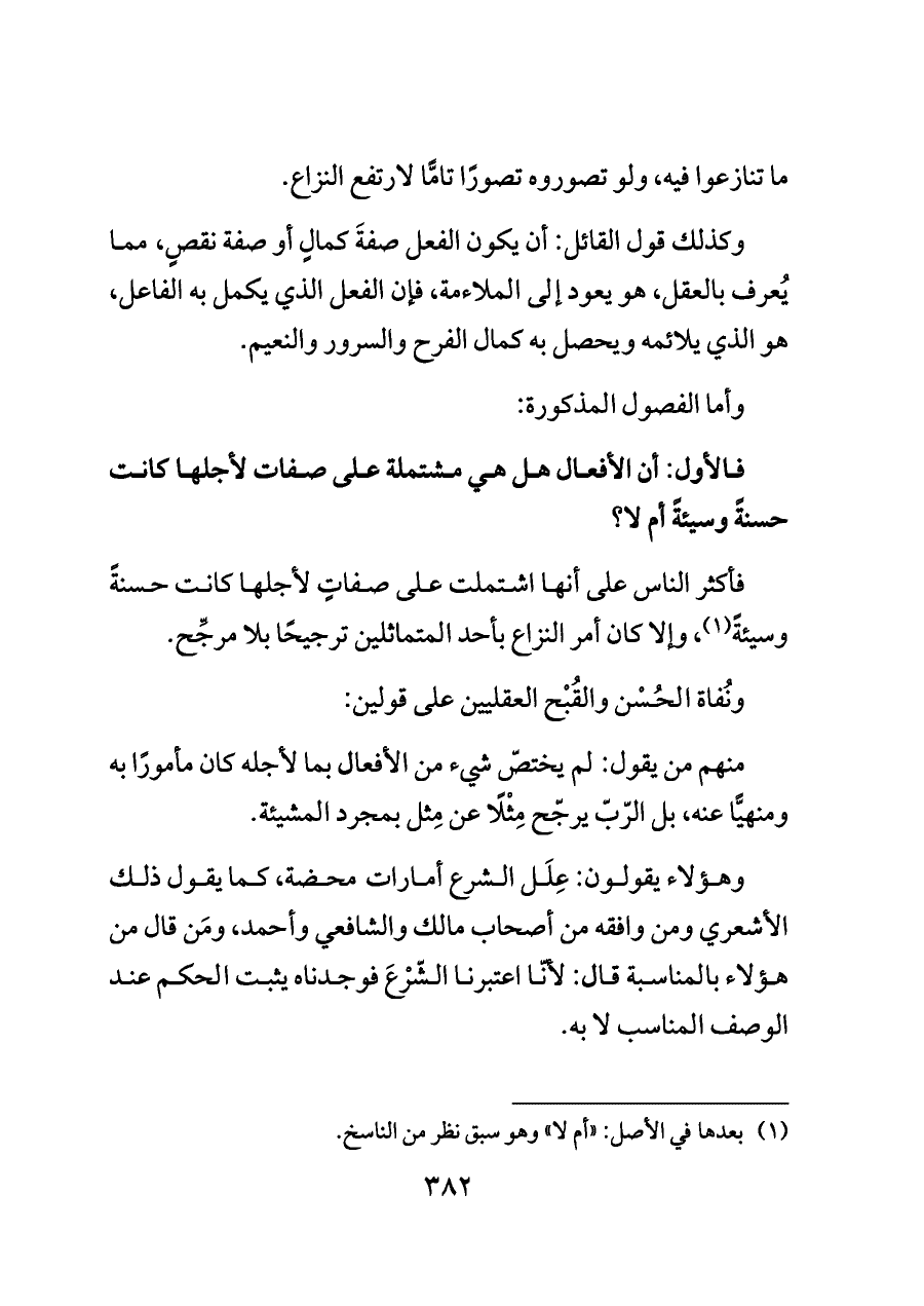 فالأول: أن الأفعال هل هي مشتملة على صفات لأجلها كانت حسنةً وسيئةً أم لا؟