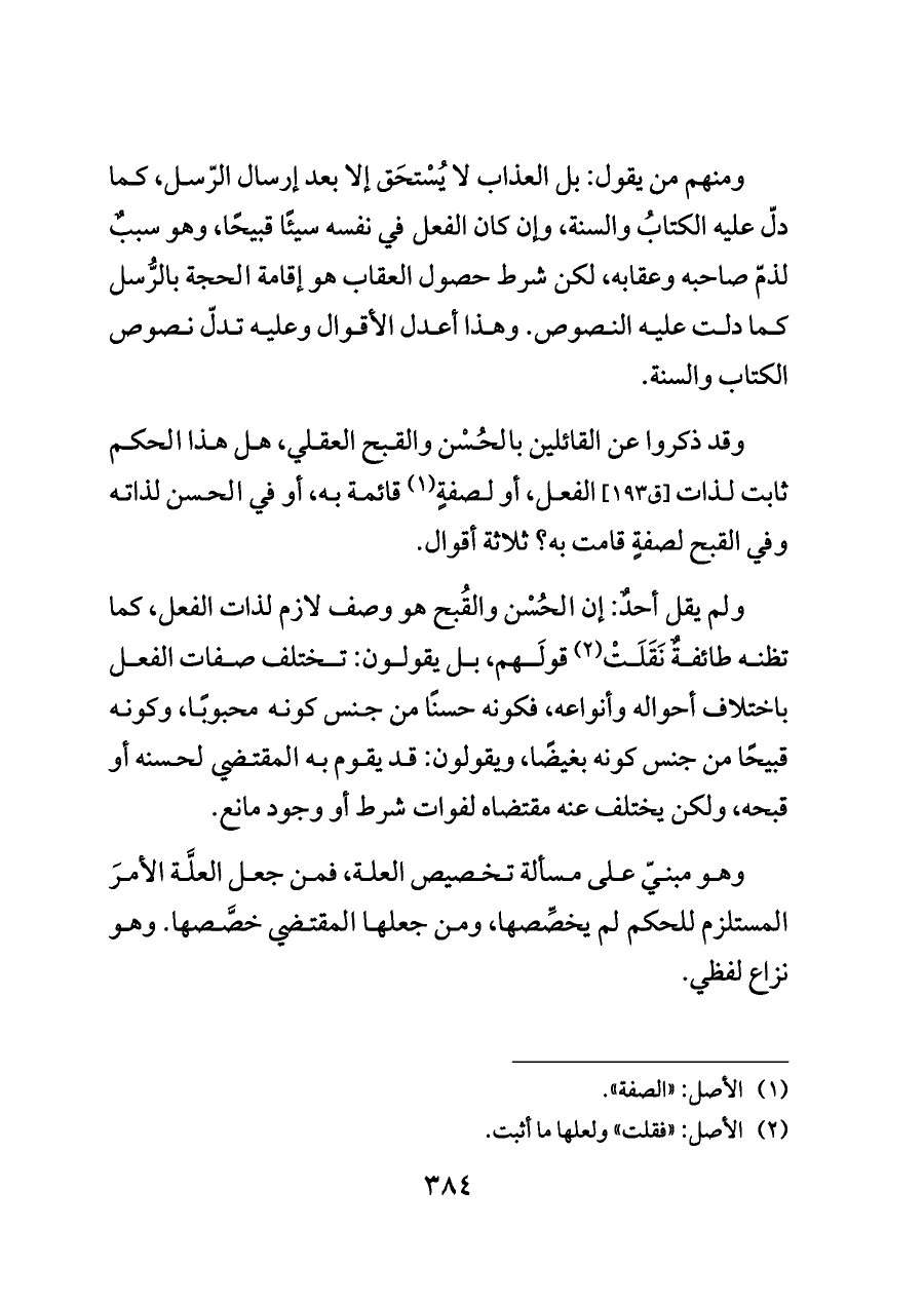 ومنهم من يقول: بل العذاب لا يُسْتحَق إلا بعد إرسال الرّسل، كما دلّ عليه الكتابُ والسنة، وإن كان الفعل في نفسه سيئًا قبيحًا، وهو سببٌ لذمّ صاحبه وعقابه، لكن شرط حصول العقاب هو إقامة الحجة بالرُّسل كما دلت عليه النصوص. وهذا أعدل الأقوال وعليه تدلّ نصوص الكتاب والسنة.
