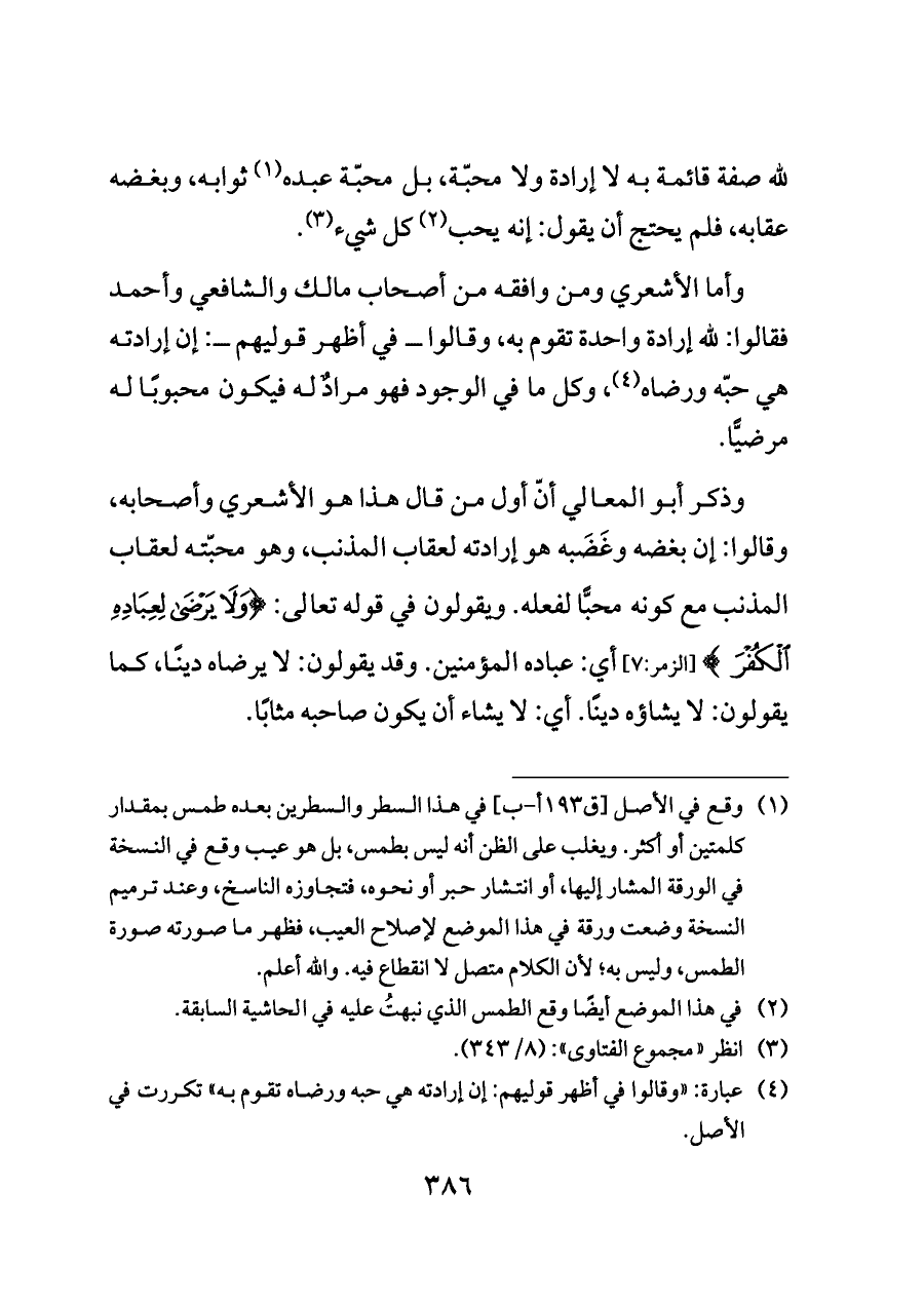 وذكر أبو المعالي أنّ أول من قال هذا هو الأشعري وأصحابه، وقالوا: إن بغضه وغَضَبه هو إرادته لعقاب المذنب، وهو محبّته لعقاب المذنب مع كونه محبًّا لفعله. ويقولون في قوله تعالى: {وَلَا يَرْضَى لِعِبَادِهِ الْكُفْرَ} [الزمر:٧] أي: عباده المؤمنين. وقد يقولون: لا يرضاه دينًا، كما يقولون: لا يشاؤه دينًا. أي: لا يشاء أن يكون صاحبه مثابًا.
