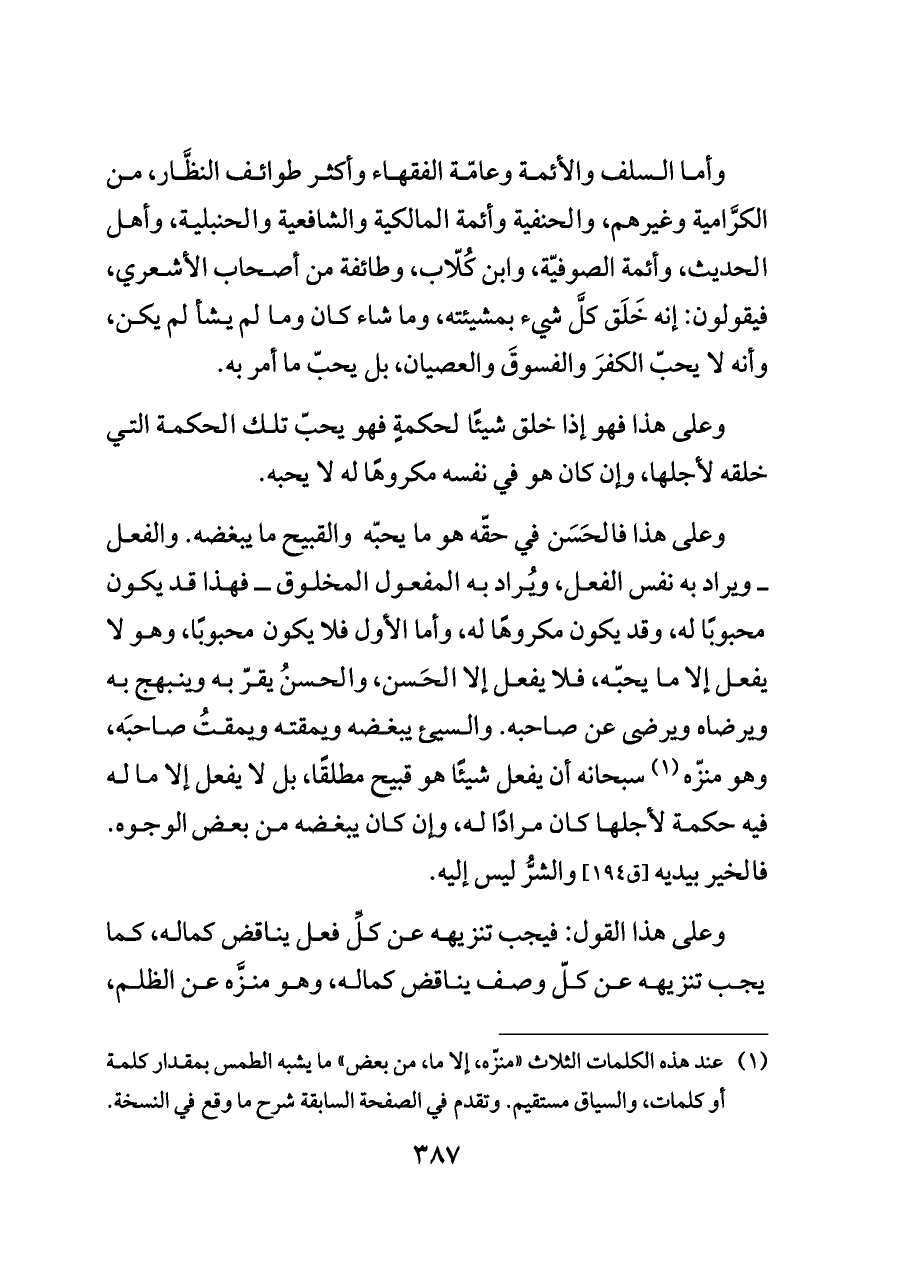 وأما السلف والأئمة وعامّة الفقهاء وأكثر طوائف النظَّار، من الكرَّامية وغيرهم، والحنفية وأئمة المالكية والشافعية والحنبلية، وأهل الحديث، وأئمة الصوفيّة، وابن كُلّاب، وطائفة من أصحاب الأشعري، فيقولون: إنه خَلَق كلَّ شيء بمشيئته، وما شاء كان وما لم يشأ لم يكن، وأنه لا يحبّ الكفرَ والفسوقَ والعصيان، بل يحبّ ما أمر به.