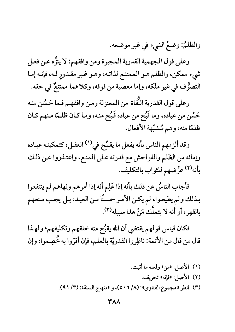 وعلى قول القدرية النُّفاة من المعتزلة ومن وافقهم فما حَسُن منه حَسُن من عباده، وما قَبُح من عباده قَبُح منه، وما كان ظلمًا منهم كان ظلمًا منه، وهم مُشبّهة الأفعال.