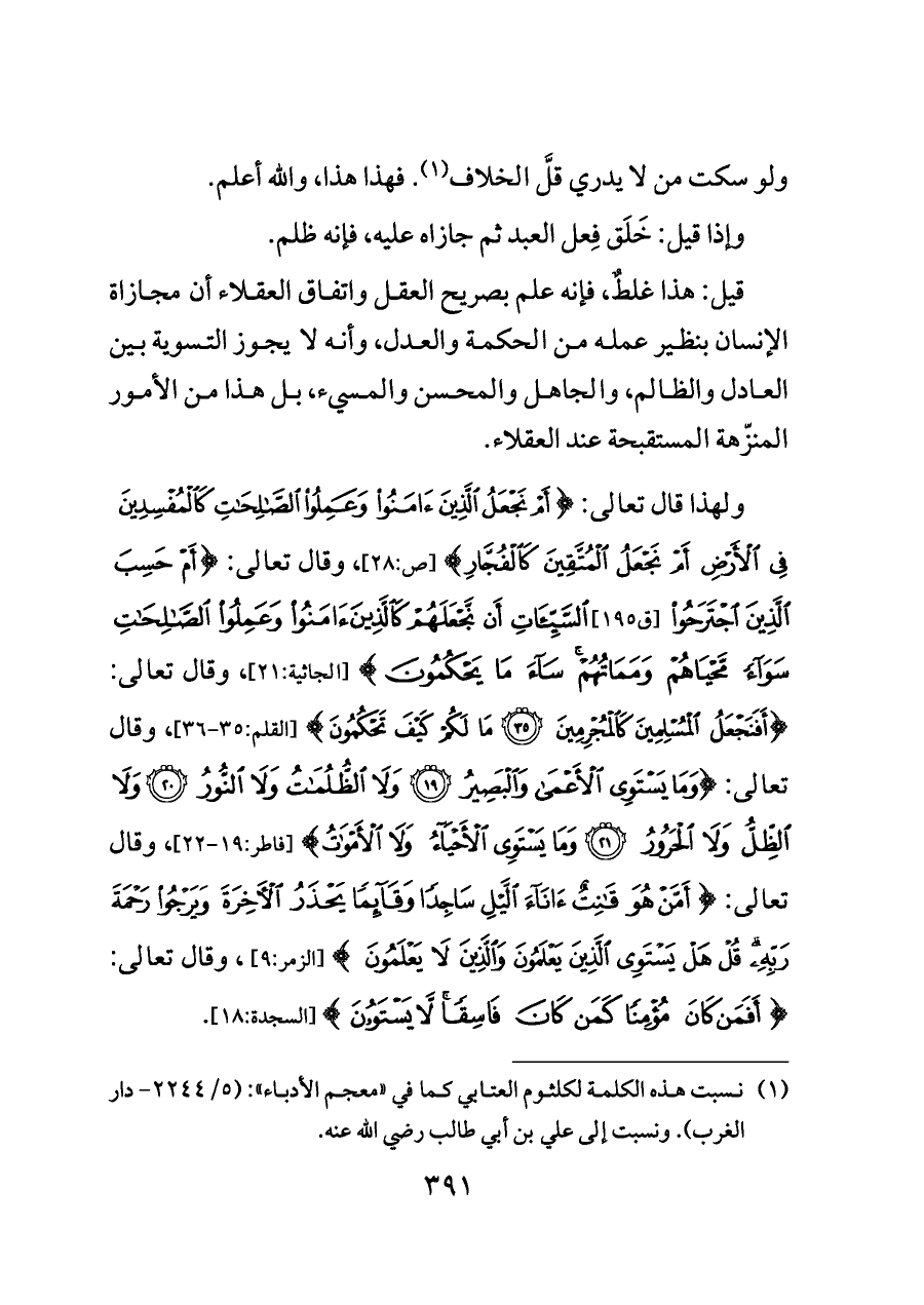 قيل: هذا غلطٌ، فإنه علم بصريح العقل واتفاق العقلاء أن مجازاة الإنسان بنظير عمله من الحكمة والعدل، وأنه لا يجوز التسوية بين العادل والظالم، والجاهل والمحسن والمسيء، بل هذا من الأمور المنزّهة المستقبحة عند العقلاء.