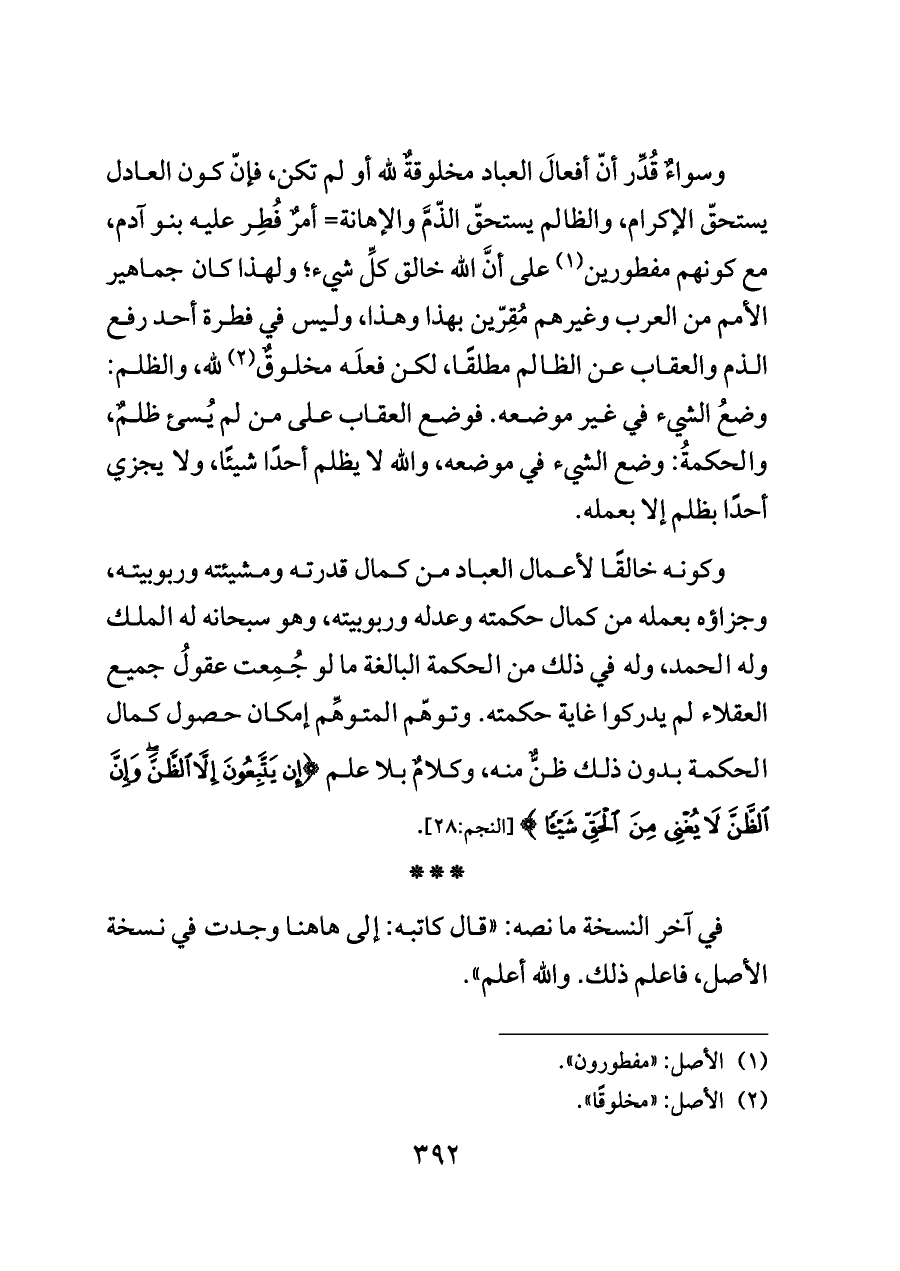 وسواءٌ قُدِّر أنّ أفعالَ العباد مخلوقةٌ لله أو لم تكن، فإنّ كون العادل يستحقّ الإكرام، والظالم يستحقّ الذّمَّ والإهانة= أمرٌ فُطِر عليه بنو آدم، مع كونهم مفطورين (¬١) على أنَّ الله خالق كلِّ شيء؛ ولهذا كان جماهير الأمم من العرب وغيرهم مُقِرّين بهذا وهذا، وليس في فطرة أحد رفع الذم والعقاب عن الظالم مطلقًا، لكن فعلَه مخلوقٌ (¬٢) لله، والظلم: وضعُ الشيء في غير موضعه. فوضع العقاب على من لم يُسئ ظلمٌ، والحكمةُ: وضع الشيء في موضعه، والله لا يظلم أحدًا شيئًا، ولا يجزي أحدًا بظلم إلا بعمله.
