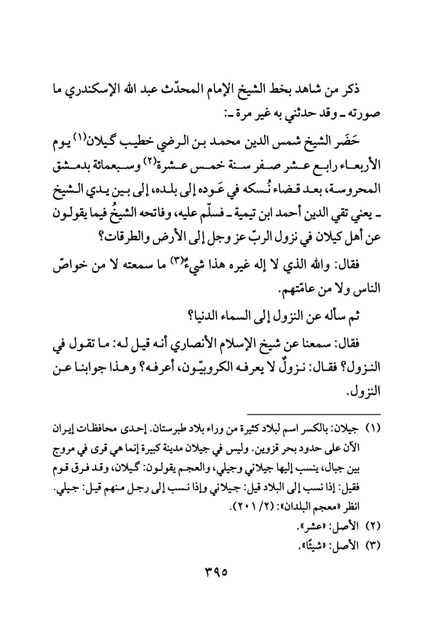 حَضَر الشيخ شمس الدين محمد بن الرضي خطيب گيلان (¬١) يوم الأربعاء رابع عشر صفر سنة خمس عشرة (¬٢) وسبعمائة بدمشق المحروسة، بعد قضاء نُسكه في عَوده إلى بلده، إلى بين يدي الشيخ ــ يعني تقي الدين أحمد ابن تيمية ــ فسلّم عليه، وفاتحه الشيخُ فيما يقولون عن أهل كيلان في نزول الربّ عز وجل إلى الأرض والطرقات؟