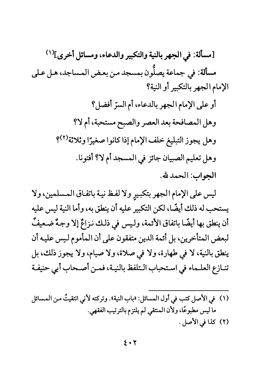 (¬١) في الأصل كتب في أول المسائل: "باب النية". وتركته لأني انتقيتُ من المسائل ما ليس مطبوعًا، ولأن المنتقي لم يلتزم بالترتيب الفقهي.