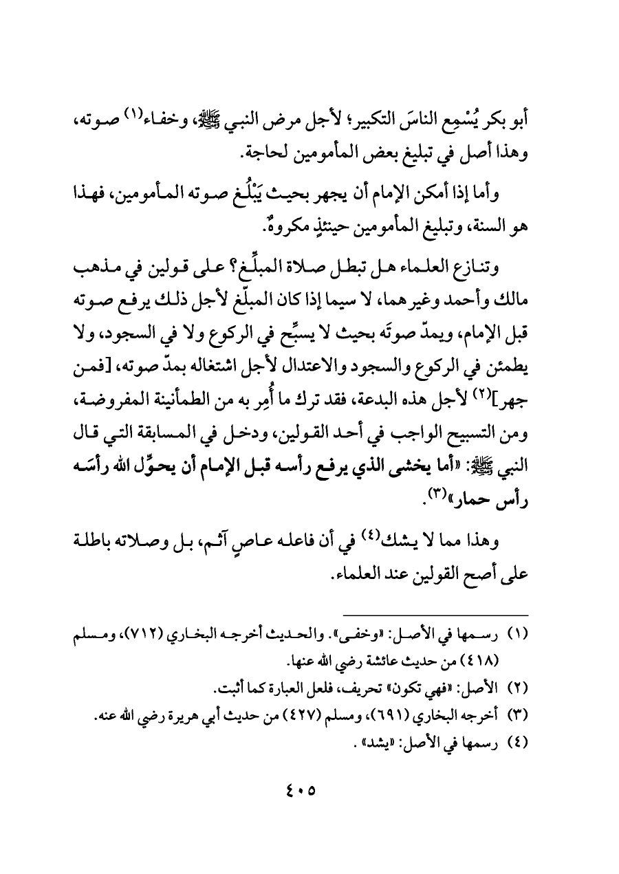 وتنازع العلماء هل تبطل صلاة المبلِّغ؟ على قولين في مذهب مالك وأحمد وغيرهما، لا سيما إذا كان المبلّغ لأجل ذلك يرفع صوته قبل الإمام، ويمدّ صوتَه بحيث لا يسبِّح في الركوع ولا في السجود، ولا يطمئن في الركوع والسجود والاعتدال لأجل اشتغاله بمدّ صوته، [فمن جهر] (¬٢) لأجل هذه البدعة، فقد ترك ما أُمِر به من الطمأنينة المفروضة، ومن التسبيح الواجب في أحد القولين، ودخل في المسابقة التي قال النبي - صلى الله عليه وسلم -: "أما يخشى الذي يرفع رأسه قبل الإمام أن يحوِّل الله رأسَه رأس حمار" (¬٣).