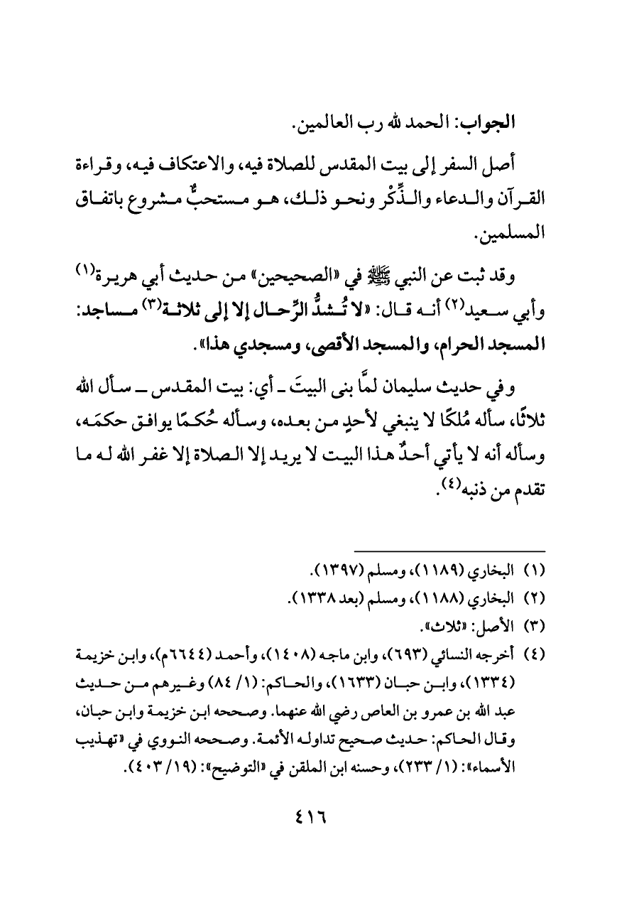 أصل السفر إلى بيت المقدس للصلاة فيه، والاعتكاف فيه، وقراءة القرآن والدعاء والذِّكْر ونحو ذلك، هو مستحبٌّ مشروع باتفاق المسلمين.