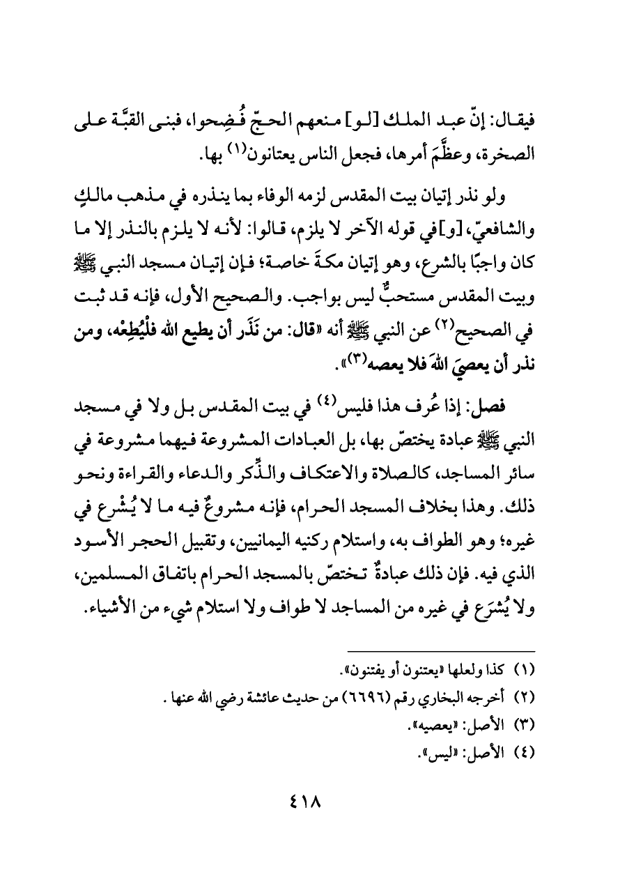 ولو نذر إتيان بيت المقدس لزمه الوفاء بما ينذره في مذهب مالكٍ والشافعيّ، [و] في قوله الآخر لا يلزم، قالوا: لأنه لا يلزم بالنذر إلا ما كان واجبًا بالشرع، وهو إتيان مكةَ خاصة؛ فإن إتيان مسجد النبي - صلى الله عليه وسلم - وبيت المقدس مستحبٌّ ليس بواجب. والصحيح الأول، فإنه قد ثبت في الصحيح (¬٢) عن النبي - صلى الله عليه وسلم - أنه "قال: من نَذَر أن يطيع الله فلْيُطِعْه، ومن نذر أن يعصيَ اللهَ فلا يعصه (¬٣) ".