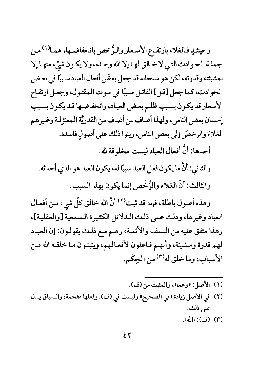 وهذه أصول باطلة، فإنه قد ثبت (¬٢) أنّ الله خالق كلّ شيء من أفعال العباد وغيرها، ودلت على ذلك الدلائل الكثيرة السمعية [والعقلية]، وهذا متفق عليه من السلف والأئمة، وهم مع ذلك يقولون: إن العباد لهم قدرة ومشيئة، وأنهم فاعلون لأفعالهم، ويثبتون ما خلقه الله من الأسباب، وما خلق له (¬٣) من الحِكَم.