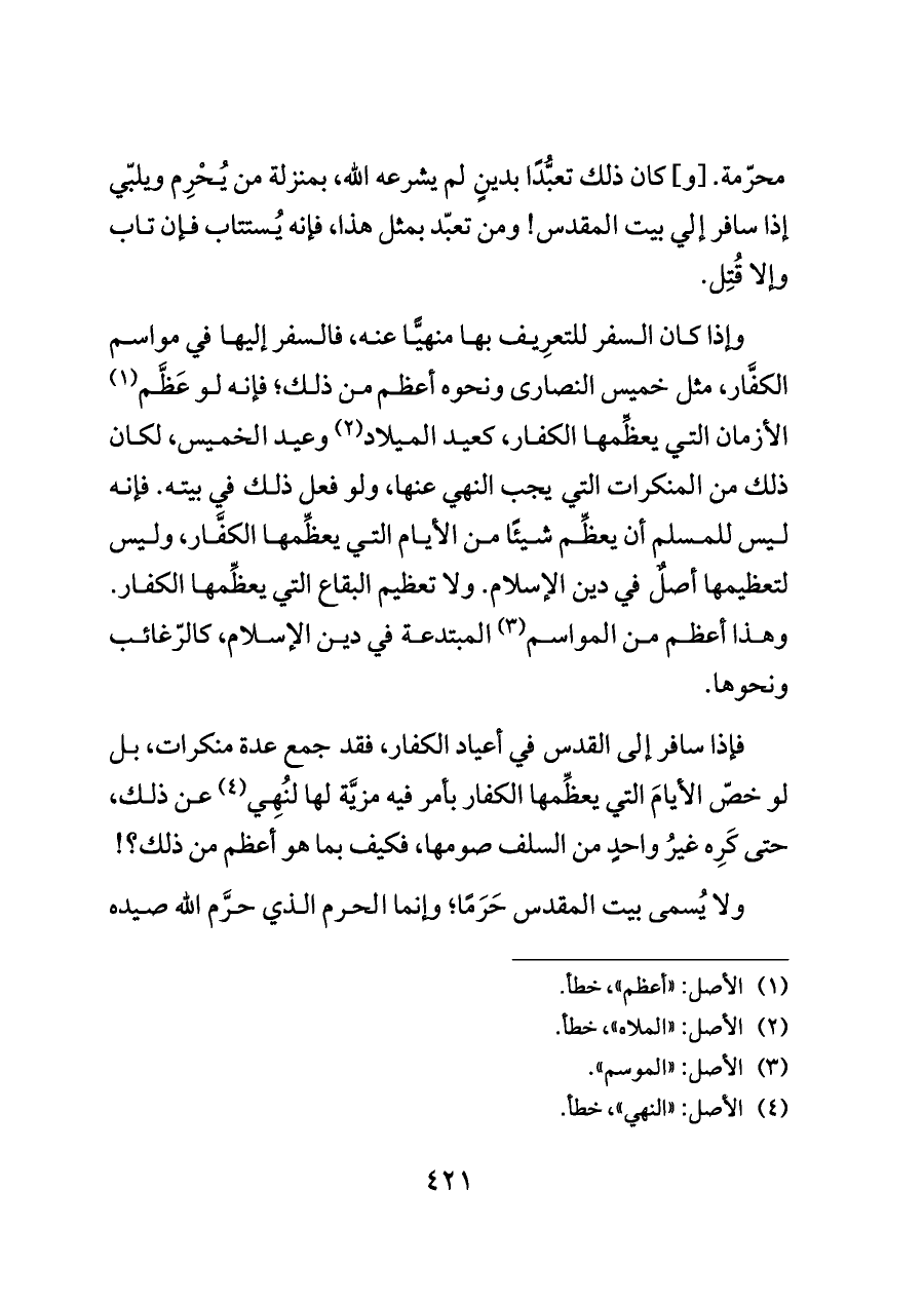 فإذا سافر إلى القدس في أعياد الكفار، فقد جمع عدة منكرات، بل لو خصّ الأيامَ التي يعظِّمها الكفار بأمر فيه مزيَّة لها لنُهِي (¬٤) عن ذلك، حتى كَرِه غيرُ واحدٍ من السلف صومها، فكيف بما هو أعظم من ذلك؟!