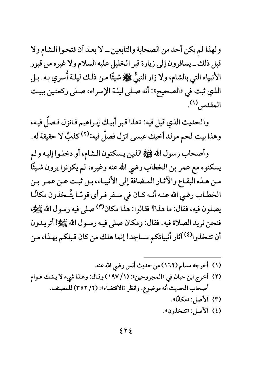ولهذا لم يكن أحد من الصحابة والتابعين ــ لا بعد أن فتحوا الشام ولا قبل ذلك ــ يسافرون إلى زيارة قبر الخليل عليه السلام ولا غيره من قبور الأنبياء التي بالشام، ولا زار النبيُّ - صلى الله عليه وسلم - شيئًا من ذلك ليلة أُسري به. بل الذي ثبت في "الصحيح": أنه صلى ليلة الإسراء، صلى ركعتين ببيت المقدس (¬١).