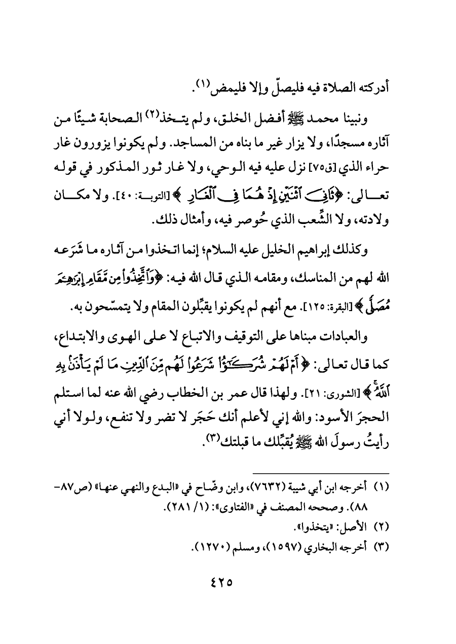 ونبينا محمد - صلى الله عليه وسلم - أفضل الخلق، ولم يتخذ (¬٢) الصحابة شيئًا من آثاره مسجدًا، ولا يزار غير ما بناه من المساجد. ولم يكونوا يزورون غار حراء الذي [ق ٧٥] نزل عليه فيه الوحي، ولا غار ثور المذكور في قوله تعالى: {ثَانِيَ اثْنَيْنِ إِذْ هُمَا فِي الْغَارِ} [التوبة: ٤٠]. ولا مكان ولادته، ولا الشِّعب الذي حُوصر فيه، وأمثال ذلك.