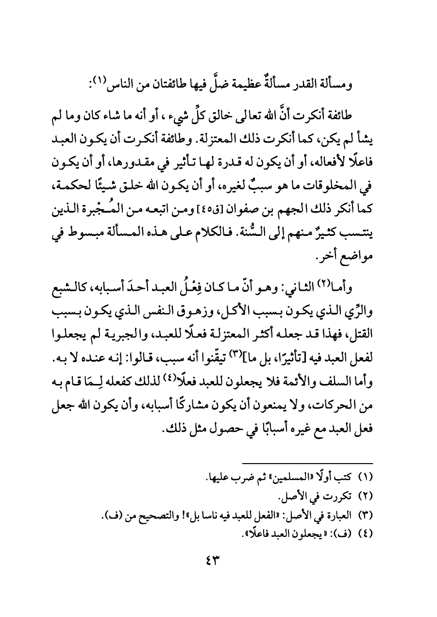 طائفة أنكرت أنَّ الله تعالى خالق كلِّ شيء، أو أنه ما شاء كان وما لم يشأ لم يكن، كما أنكرت ذلك المعتزلة. وطائفة أنكرت أن يكون العبد فاعلًا لأفعاله، أو أن يكون له قدرة لها تأثير في مقدورها، أو أن يكون في المخلوقات ما هو سببٌ لغيره، أو أن يكون الله خلق شيئًا لحكمة، كما أنكر ذلك الجهم بن صفوان [ق ٤٥] ومن اتبعه من المُجْبرة الذين ينتسب كثيرٌ منهم إلى السُّنة. فالكلام على هذه المسألة مبسوط في مواضع أخر.