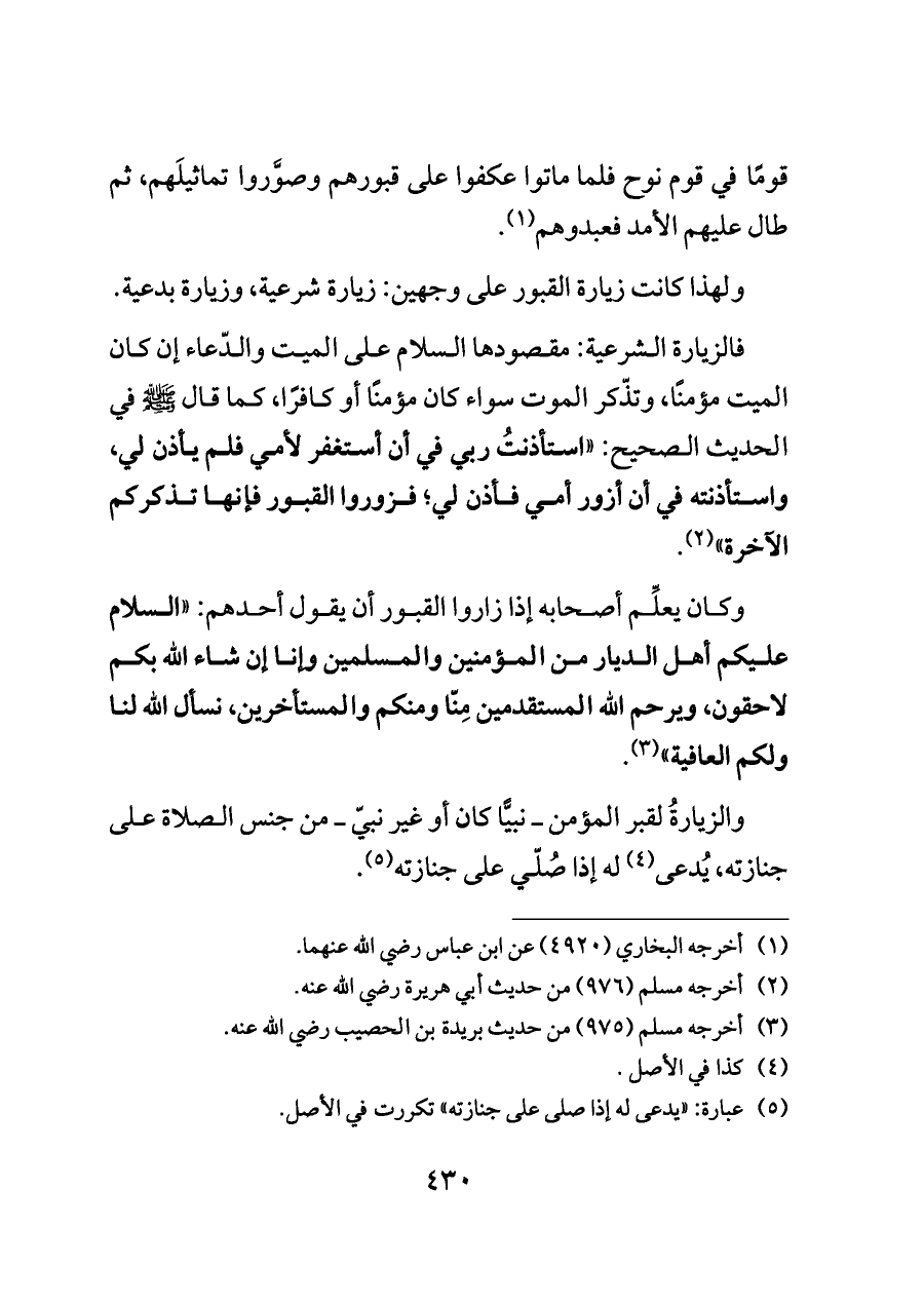 فالزيارة الشرعية: مقصودها السلام على الميت والدّعاء إن كان الميت مؤمنًا، وتذّكر الموت سواء كان مؤمنًا أو كافرًا، كما قال - صلى الله عليه وسلم - في الحديث الصحيح: "استأذنتُ ربي في أن أستغفر لأمي فلم يأذن لي، واستأذنته في أن أزور أمي فأذن لي؛ فزوروا القبور فإنها تذكركم الآخرة" (¬٢).