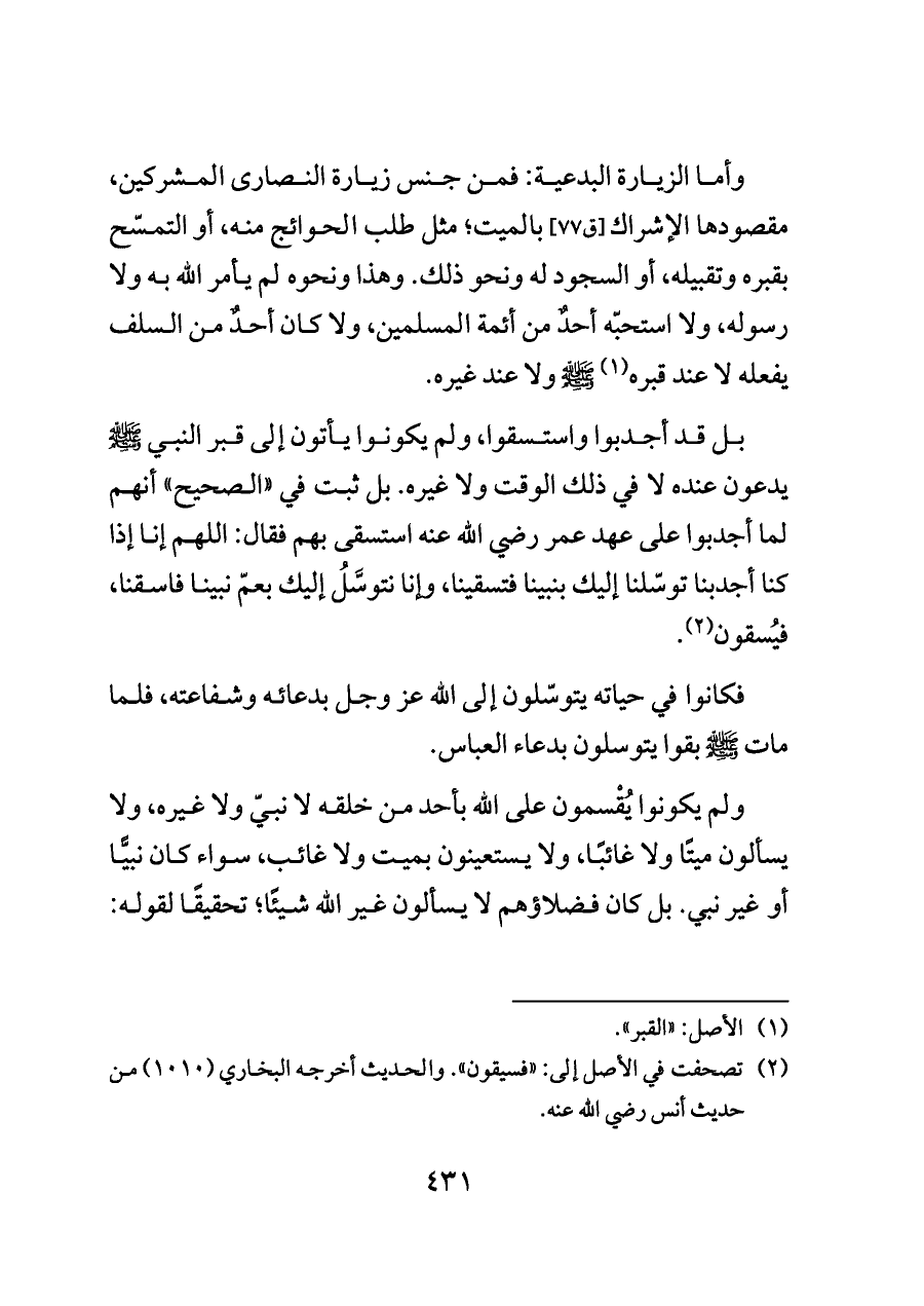 ولم يكونوا يُقْسمون على الله بأحد من خلقه لا نبيّ ولا غيره، ولا يسألون ميتًا ولا غائبًا، ولا يستعينون بميت ولا غائب، سواء كان نبيًّا أو غير نبي. بل كان فضلاؤهم لا يسألون غير الله شيئًا؛ تحقيقًا لقوله: