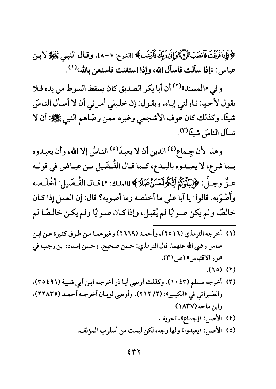 {فَإِذَا فَرَغْتَ فَانْصَبْ (٧) وَإِلَى رَبِّكَ فَارْغَبْ} [الشرح: ٧ - ٨]. وقال النبي - صلى الله عليه وسلم - لابن عباس: "إذا سألت فاسأل الله، وإذا استغنت فاستعن بالله" (¬١).