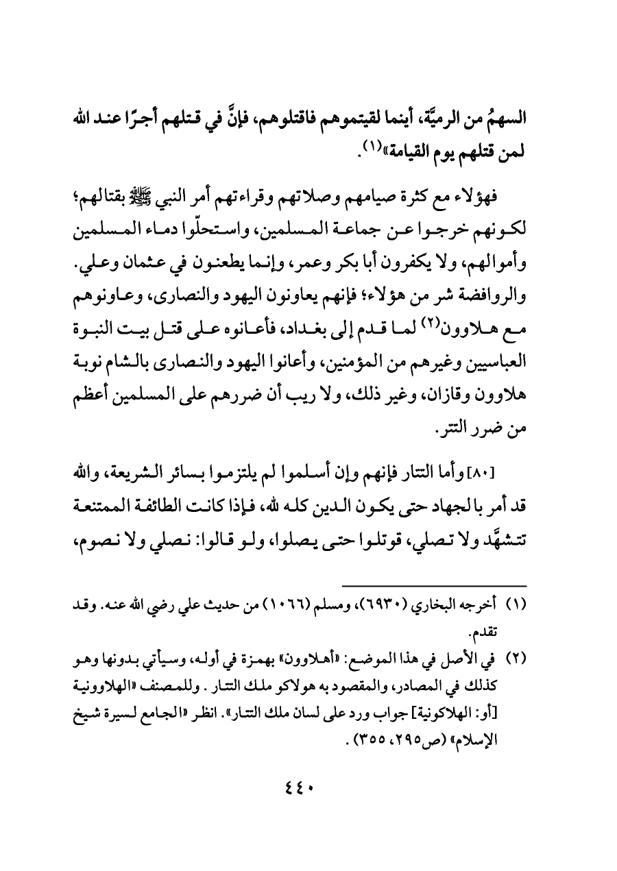 فهؤلاء مع كثرة صيامهم وصلاتهم وقراءتهم أمر النبي - صلى الله عليه وسلم - بقتالهم؛ لكونهم خرجوا عن جماعة المسلمين، واستحلّوا دماء المسلمين وأموالهم، ولا يكفرون أبا بكر وعمر، وإنما يطعنون في عثمان وعلي. والروافضة شر من هؤلاء؛ فإنهم يعاونون اليهود والنصارى، وعاونوهم مع هلاوون (¬٢) لما قدم إلى بغداد، فأعانوه على قتل بيت النبوة العباسيين وغيرهم من المؤمنين، وأعانوا اليهود والنصارى بالشام نوبة هلاوون وقازان، وغير ذلك، ولا ريب أن ضررهم على المسلمين أعظم من ضرر التتر.