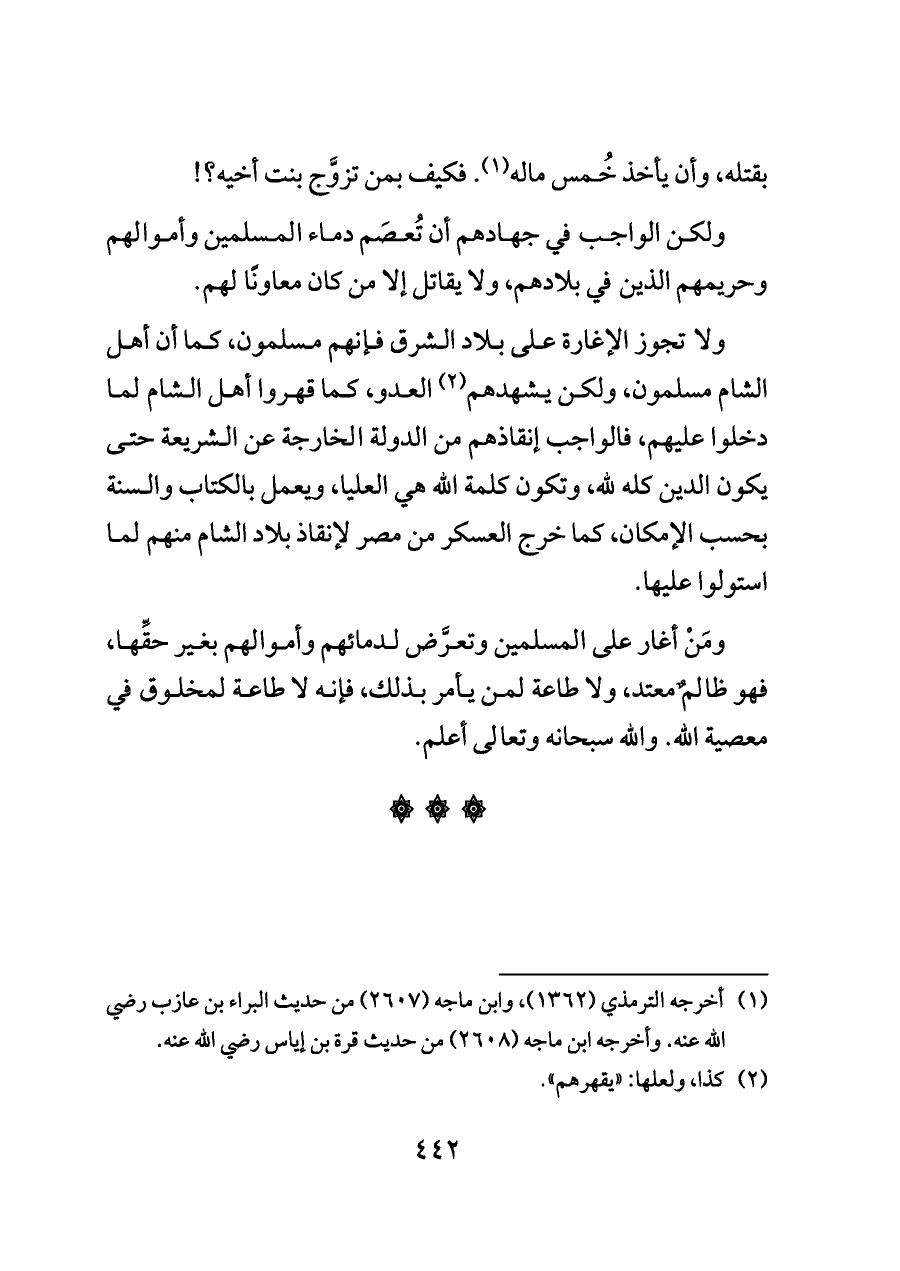 ولا تجوز الإغارة على بلاد الشرق فإنهم مسلمون، كما أن أهل الشام مسلمون، ولكن يشهدهم (¬٢) العدو، كما قهروا أهل الشام لما دخلوا عليهم، فالواجب إنقاذهم من الدولة الخارجة عن الشريعة حتى يكون الدين كله لله، وتكون كلمة الله هي العليا، ويعمل بالكتاب والسنة بحسب الإمكان، كما خرج العسكر من مصر لإنقاذ بلاد الشام منهم لما استولوا عليها.