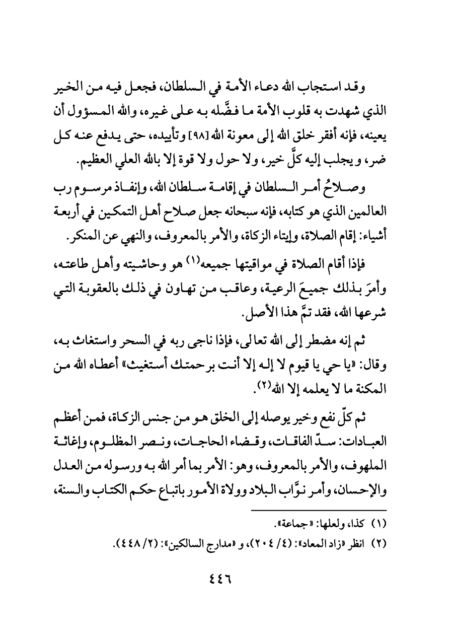 وصلاحُ أمر السلطان في إقامة سلطان الله، وإنفاذ مرسوم رب العالمين الذي هو كتابه، فإنه سبحانه جعل صلاح أهل التمكين في أربعة أشياء: إقام الصلاة، وإيتاء الزكاة، والأمر بالمعروف، والنهي عن المنكر.