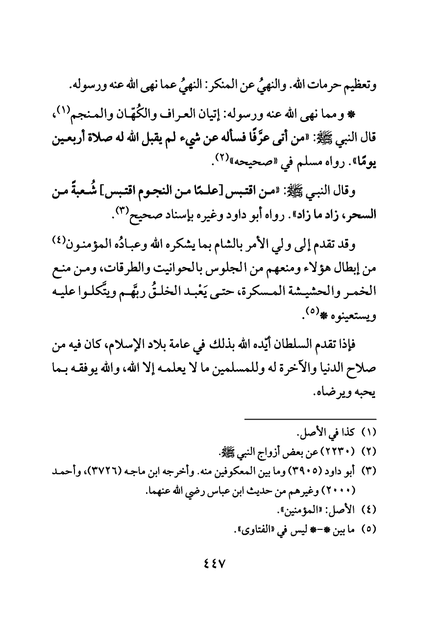 * ومما نهى الله عنه ورسوله: إتيان العراف والكُهّان والمنجم (¬١)، قال النبي - صلى الله عليه وسلم -: "من أتى عرَّفًا فسأله عن شيء لم يقبل الله له صلاة أربعين يومًا". رواه مسلم في "صحيحه" (¬٢).