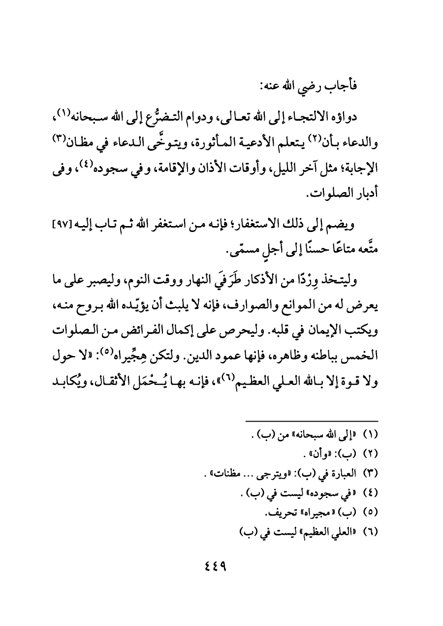 وليتخذ وِرْدًا من الأذكار طَرَفَي النهار ووقت النوم، وليصبر على ما يعرض له من الموانع والصوارف، فإنه لا يلبث أن يؤيّده الله بروح منه، ويكتب الإيمان في قلبه. وليحرص على إكمال الفرائض من الصلوات الخمس بباطنه وظاهره، فإنها عمود الدين. ولتكن هِجِّيراه (¬٥): "لا حول ولا قوة إلا بالله العلي العظيم (¬٦) "، فإنه بها يُحْمَل الأثقال، ويُكابد