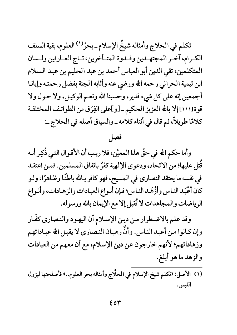 (¬١) الأصل: "تكلم شيخ الإسلام في الحلَّاج وأمثاله بحر العلوم .. " فأصلحتها ليزول اللبس.