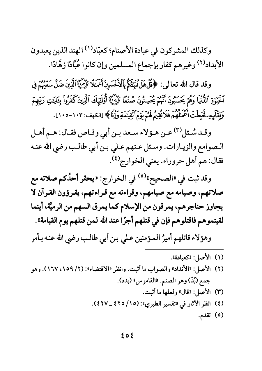 وقد سُئل (¬٣) عن هؤلاء سعد بن أبي وقاص فقال: هم أهل الصوامع والزيارات. وسئل عنهم علي بن أبي طالب رضي الله عنه فقال: هم أهل حروراء. يعني الخوارج (¬٤).