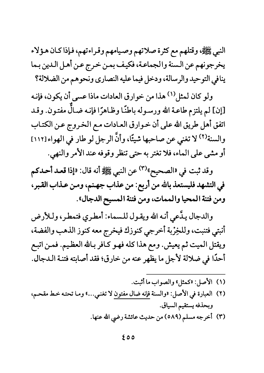 والدجال يدَّعي أنه الله ويقول للسماء: أمطري فتمطر، وللأرض أنبتي فتنبت، وللخِرْبة أخرجي كنوزك فيخرج معه كنوز الذهب والفضة، ويقتل الميت ثم يعيش. ومع هذا كله فهو كافر بالله العظيم. فمن اتبع أحدًا في ضلالة لأجل ما يظهر عنه من خارق؛ فقد أصابته فتنة الدجال.