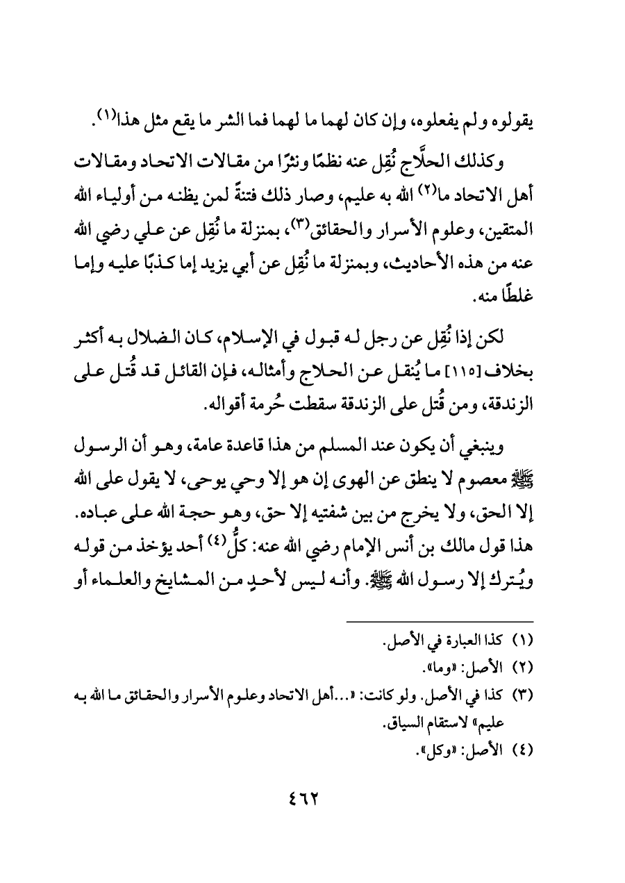 لكن إذا نُقِل عن رجل له قبول في الإسلام، كان الضلال به أكثر بخلاف [١١٥] ما يُنقل عن الحلاج وأمثاله، فإن القائل قد قُتل على الزندقة، ومن قُتل على الزندقة سقطت حُرمة أقواله.