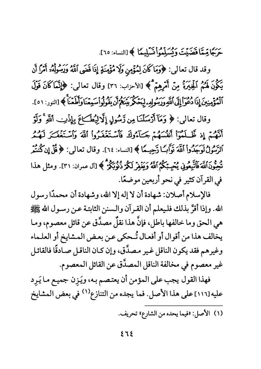 فهذا القول يجب على المؤمن أن يعتصم به، ويَزِن جميع ما يَرِد عليه [١١٦] على هذا الأصل. فما يجده من التنازع (¬١) في بعض المشايخ