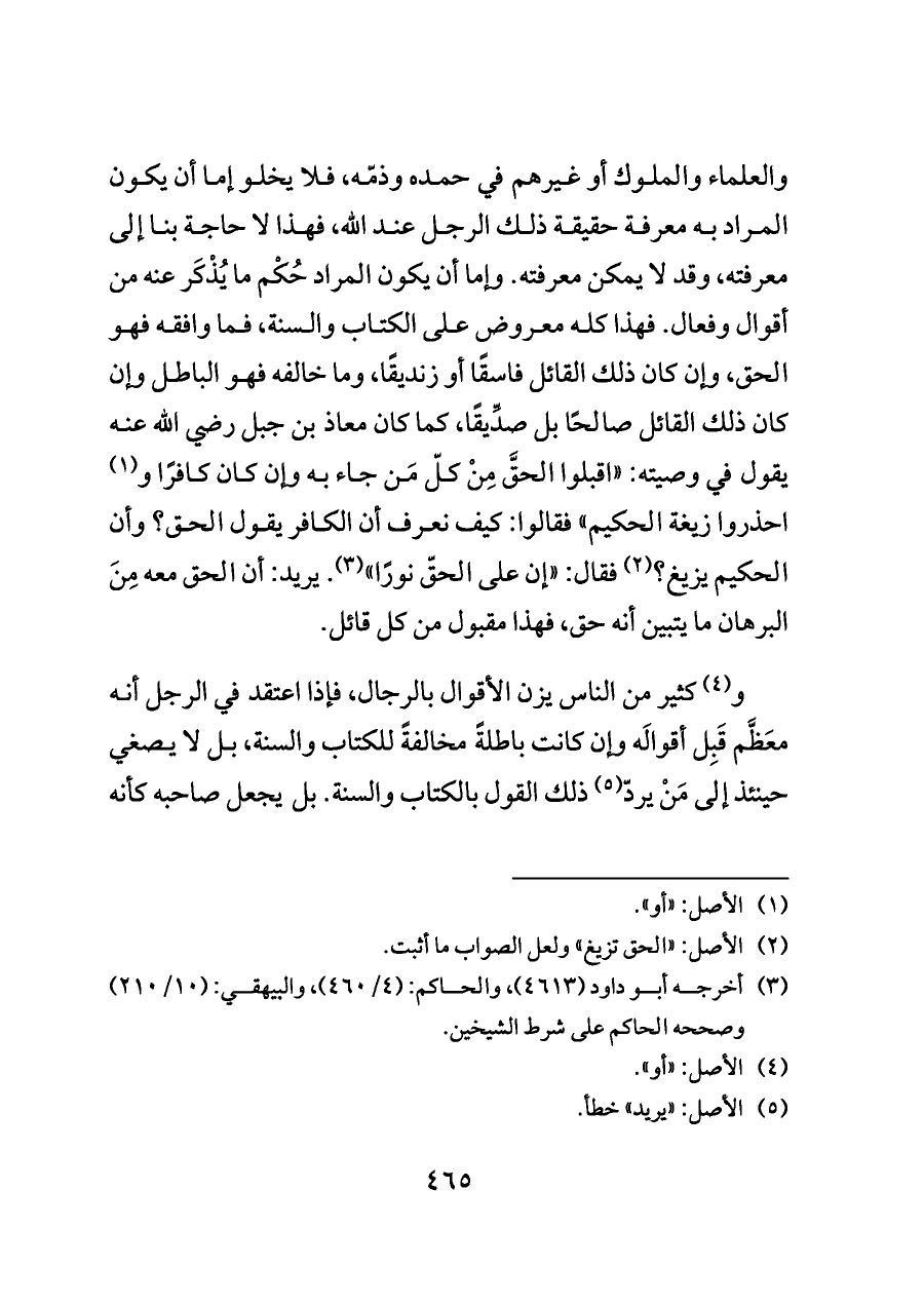 والعلماء والملوك أو غيرهم في حمده وذمّه، فلا يخلو إما أن يكون المراد به معرفة حقيقة ذلك الرجل عند الله، فهذا لا حاجة بنا إلى معرفته، وقد لا يمكن معرفته. وإما أن يكون المراد حُكْم ما يُذْكَر عنه من أقوال وفعال. فهذا كله معروض على الكتاب والسنة، فما وافقه فهو الحق، وإن كان ذلك القائل فاسقًا أو زنديقًا، وما خالفه فهو الباطل وإن كان ذلك القائل صالحًا بل صدِّيقًا، كما كان معاذ بن جبل رضي الله عنه يقول في وصيته: "اقبلوا الحقَّ مِنْ كلّ مَن جاء به وإن كان كافرًا و (¬١) احذروا زيغة الحكيم" فقالوا: كيف نعرف أن الكافر يقول الحق؟ وأن الحكيم يزيغ؟ (¬٢) فقال: "إن على الحقّ نورًا" (¬٣). يريد: أن الحق معه مِنَ البرهان ما يتبين أنه حق، فهذا مقبول من كل قائل.