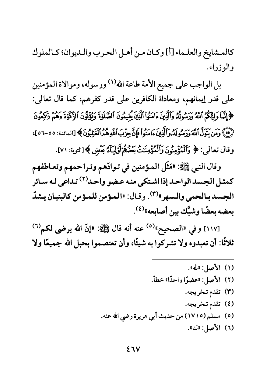 [١١٧] وفي "الصحيح" (¬٥) عنه أنه قال - صلى الله عليه وسلم -: "إنّ الله يرضى لكم (¬٦) ثلاثًا: أن تعبدوه ولا تشركوا به شيئًا، وأن تعتصموا بحبل الله جميعًا ولا
