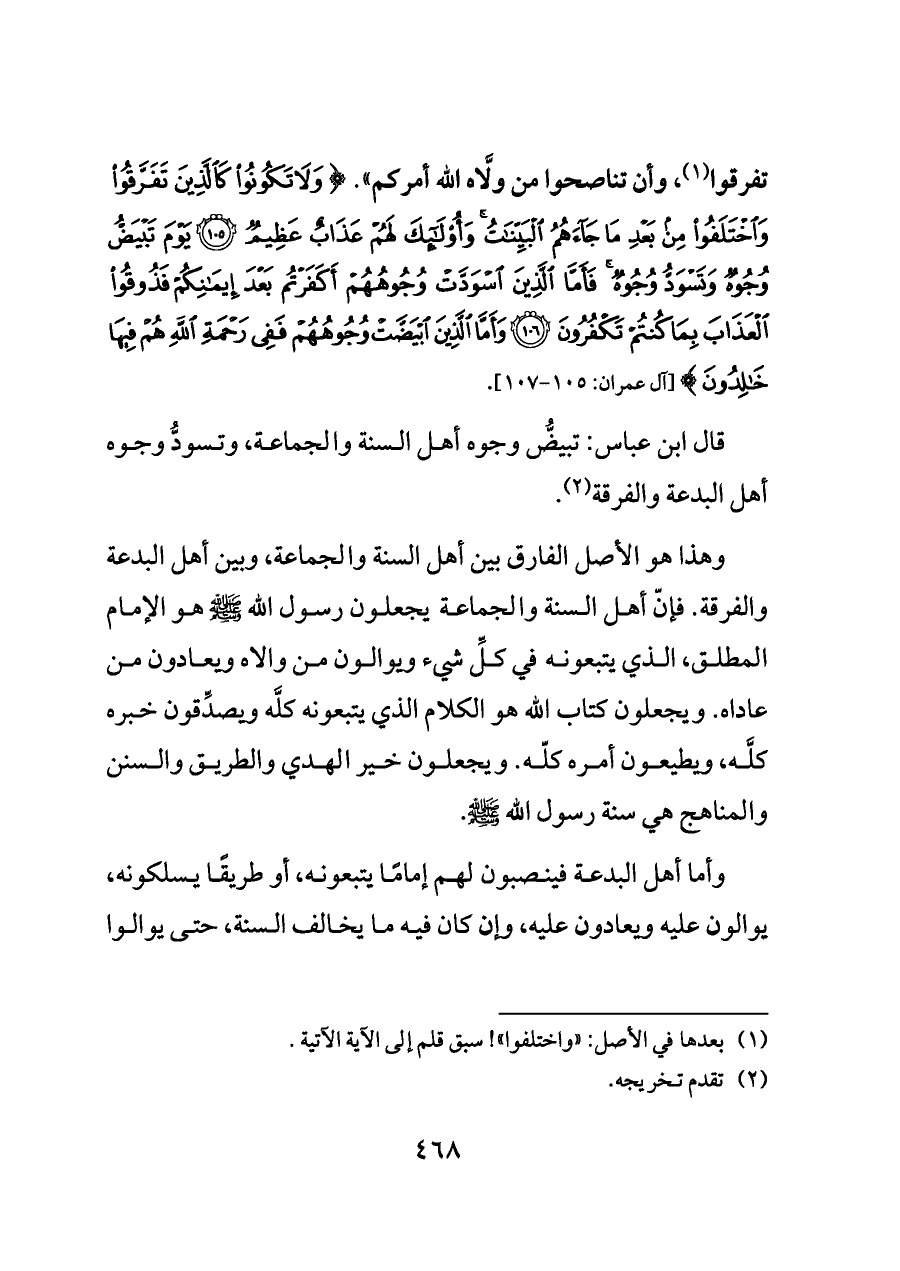 تفرقوا (¬١)، وأن تناصحوا من ولَّاه الله أمركم". {وَلَا تَكُونُوا كَالَّذِينَ تَفَرَّقُوا وَاخْتَلَفُوا مِنْ بَعْدِ مَا جَاءَهُمُ الْبَيِّنَاتُ وَأُولَئِكَ لَهُمْ عَذَابٌ عَظِيمٌ (١٠٥) يَوْمَ تَبْيَضُّ وُجُوهٌ وَتَسْوَدُّ وُجُوهٌ فَأَمَّا الَّذِينَ اسْوَدَّتْ وُجُوهُهُمْ أَكَفَرْتُمْ بَعْدَ إِيمَانِكُمْ فَذُوقُوا الْعَذَابَ بِمَا كُنْتُمْ تَكْفُرُونَ (١٠٦) وَأَمَّا الَّذِينَ ابْيَضَّتْ وُجُوهُهُمْ فَفِي رَحْمَةِ اللَّهِ هُمْ فِيهَا خَالِدُونَ} [آل عمران: ١٠٥ - ١٠٧].