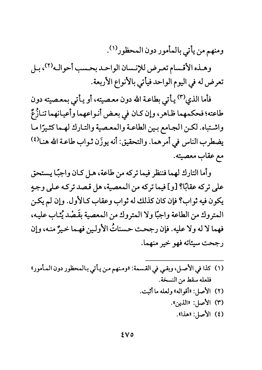 (¬١) كذا في الأصل، وبقي في القسمة: "ومنهم من يأتي بالمحظور دون المأمور" فلعله سقط من النسخة.