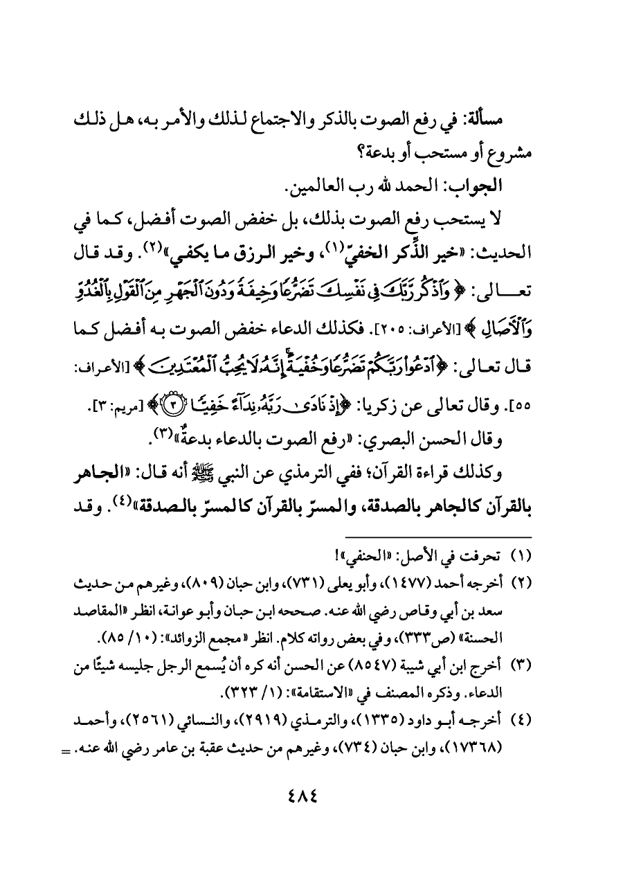 مسألة: في رفع الصوت بالذكر والاجتماع لذلك والأمر به، هل ذلك مشروع أو مستحب أو بدعة؟