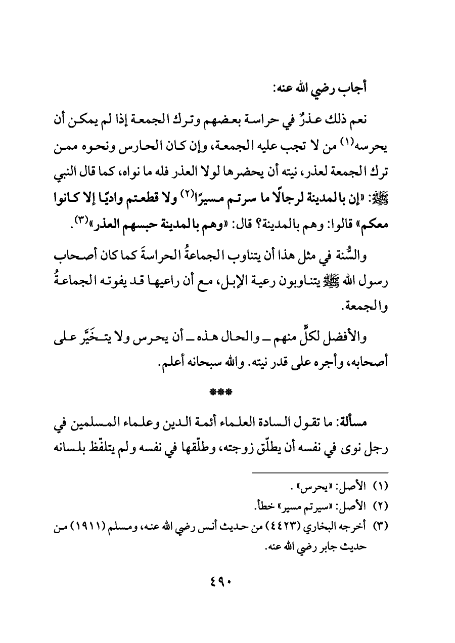 نعم ذلك عذرٌ في حراسة بعضهم وترك الجمعة إذا لم يمكن أن يحرسه (¬١) من لا تجب عليه الجمعة، وإن كان الحارس ونحوه ممن ترك الجمعة لعذر، نيته أن يحضرها لولا العذر فله ما نواه، كما قال النبي - صلى الله عليه وسلم -: "إن بالمدينة لرجالًا ما سرتم مسيرًا (¬٢) ولا قطعتم واديًا إلا كانوا معكم" قالوا: وهم بالمدينة؟ قال: "وهم بالمدينة حبسهم العذر" (¬٣).