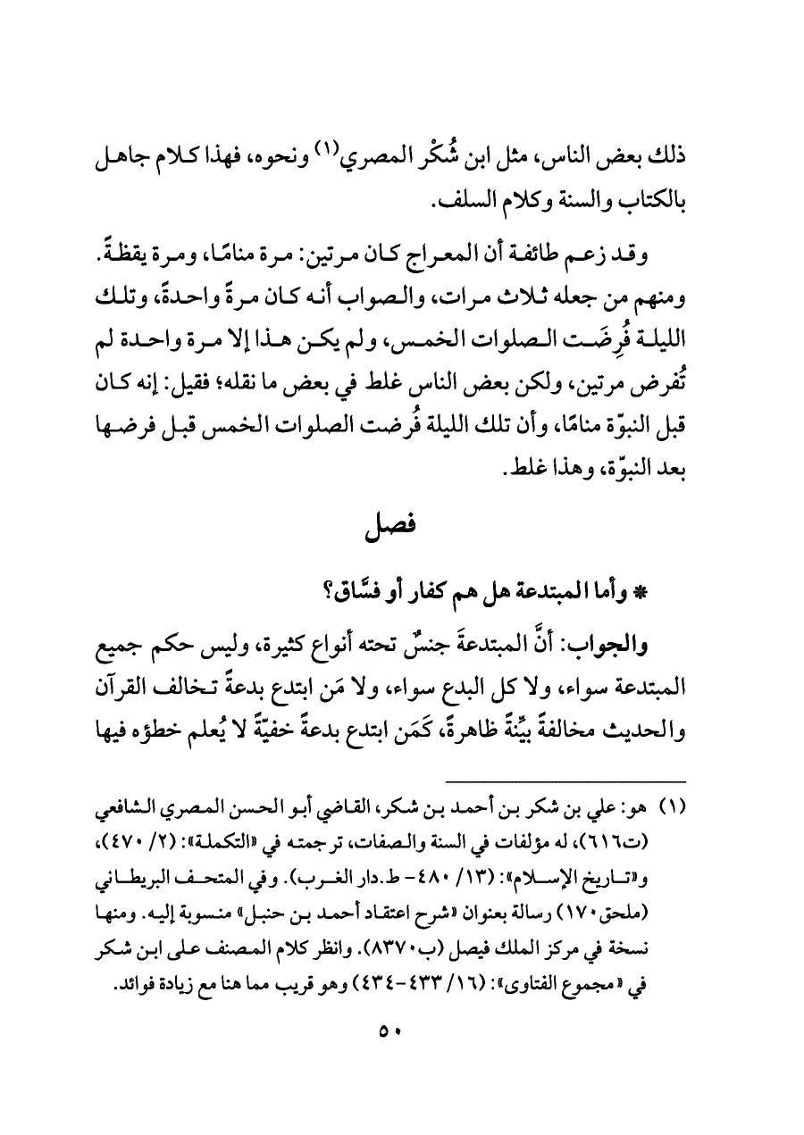 (¬١) هو: علي بن شكر بن أحمد بن شكر، القاضي أبو الحسن المصري الشافعي (ت ٦١٦)، له مؤلفات في السنة والصفات، ترجمته في «التكملة»: (٢/ ٤٧٠)، و «تاريخ الإسلام»: (١٣/ ٤٨٠ - ط. دار الغرب). وفي المتحف البريطاني (ملحق ١٧٠) رسالة بعنوان «شرح اعتقاد أحمد بن حنبل» منسوبة إليه. ومنها نسخة في مركز الملك فيصل (ب ٨٣٧٠). وانظر كلام المصنف على ابن شكر في «مجموع الفتاوى»: (١٦/ ٤٣٣ - ٤٣٤) وهو قريب مما هنا مع زيادة فوائد.